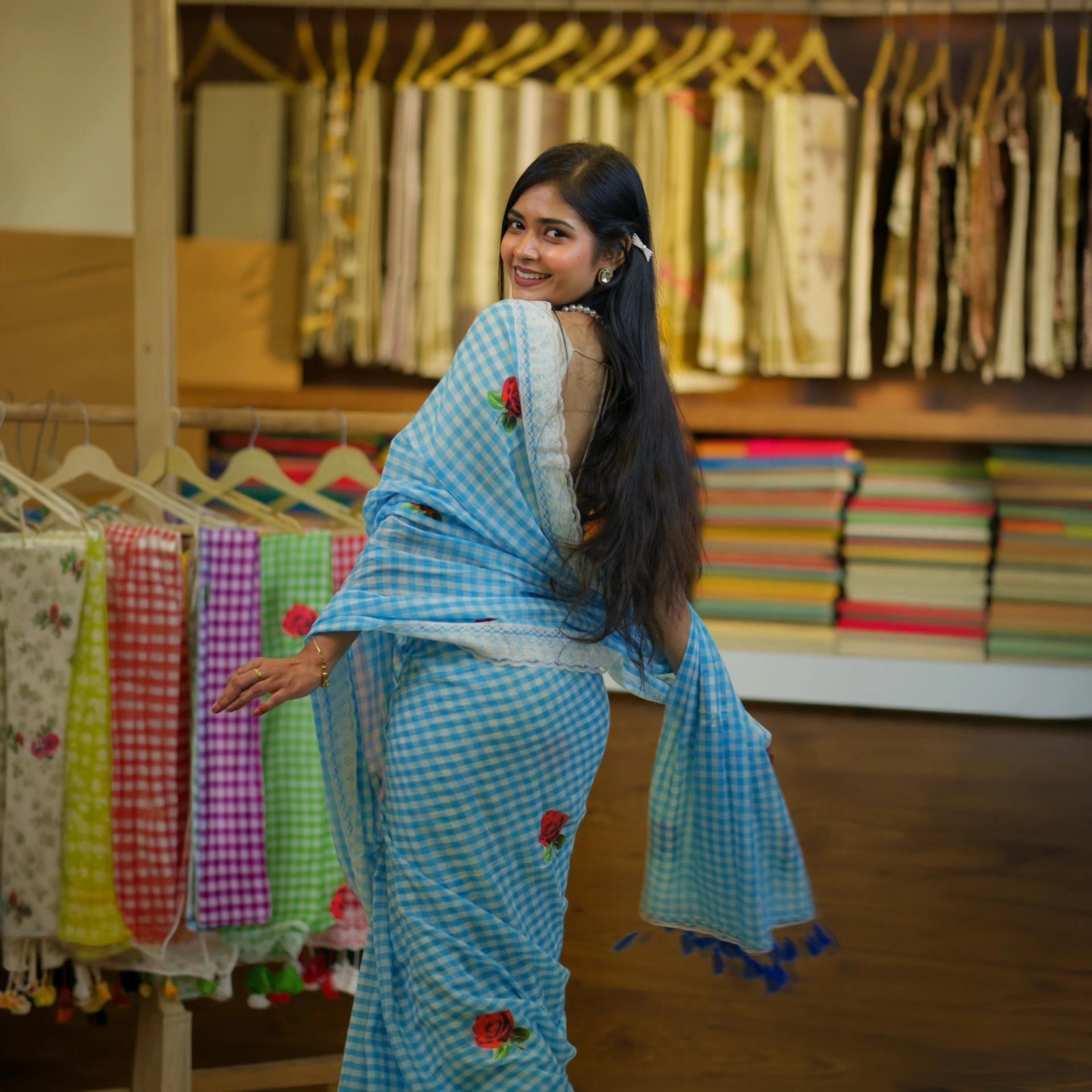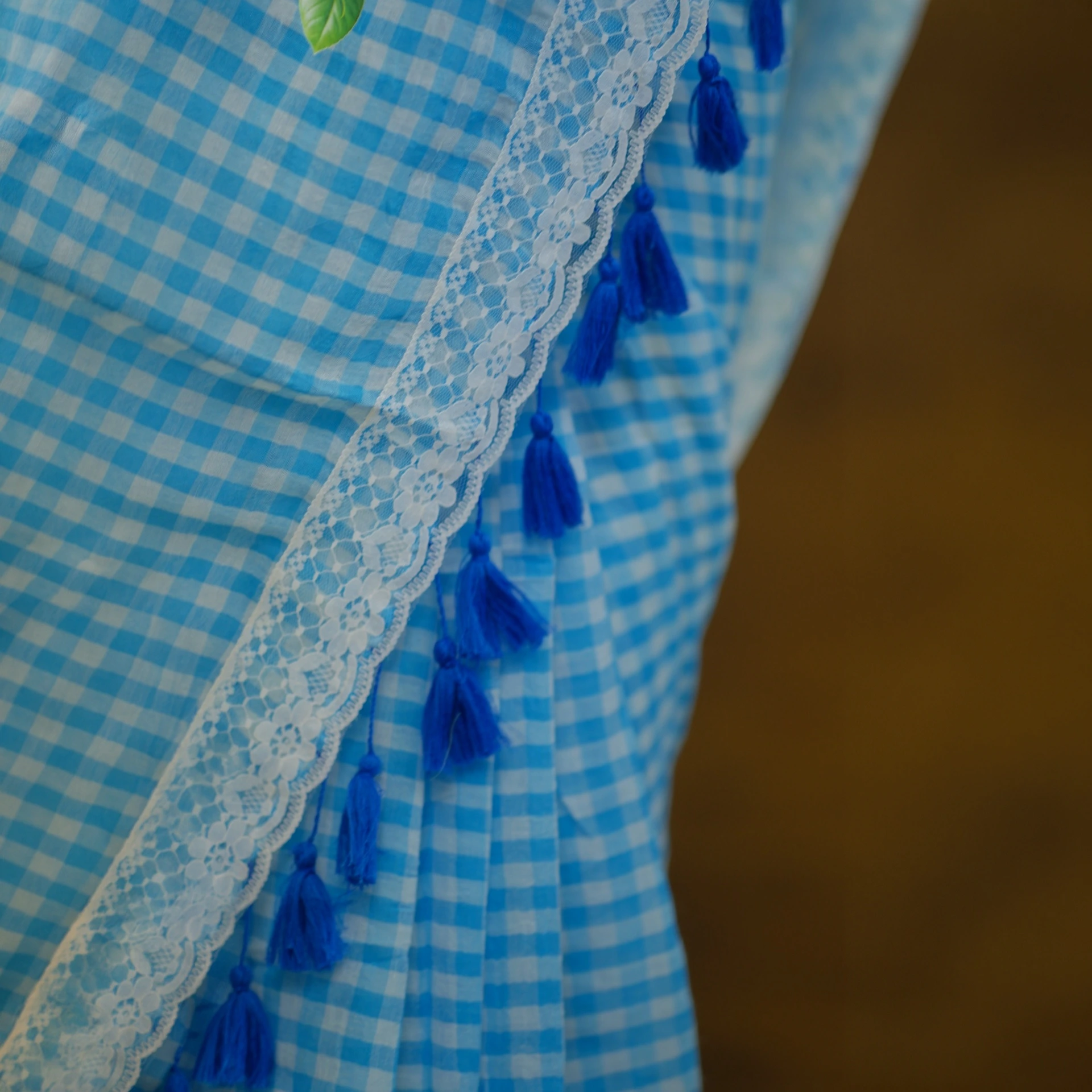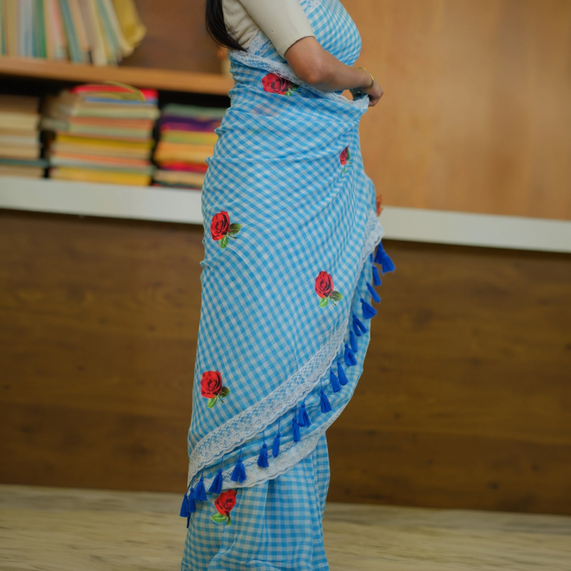 Featuring a classic checked pattern enhanced with delicate rose butta motifs, this saree blends traditional charm with a fresh, feminine touch. The look is beautifully finished with a lace work border, adding subtle elegance and uniqueness to the overall design.