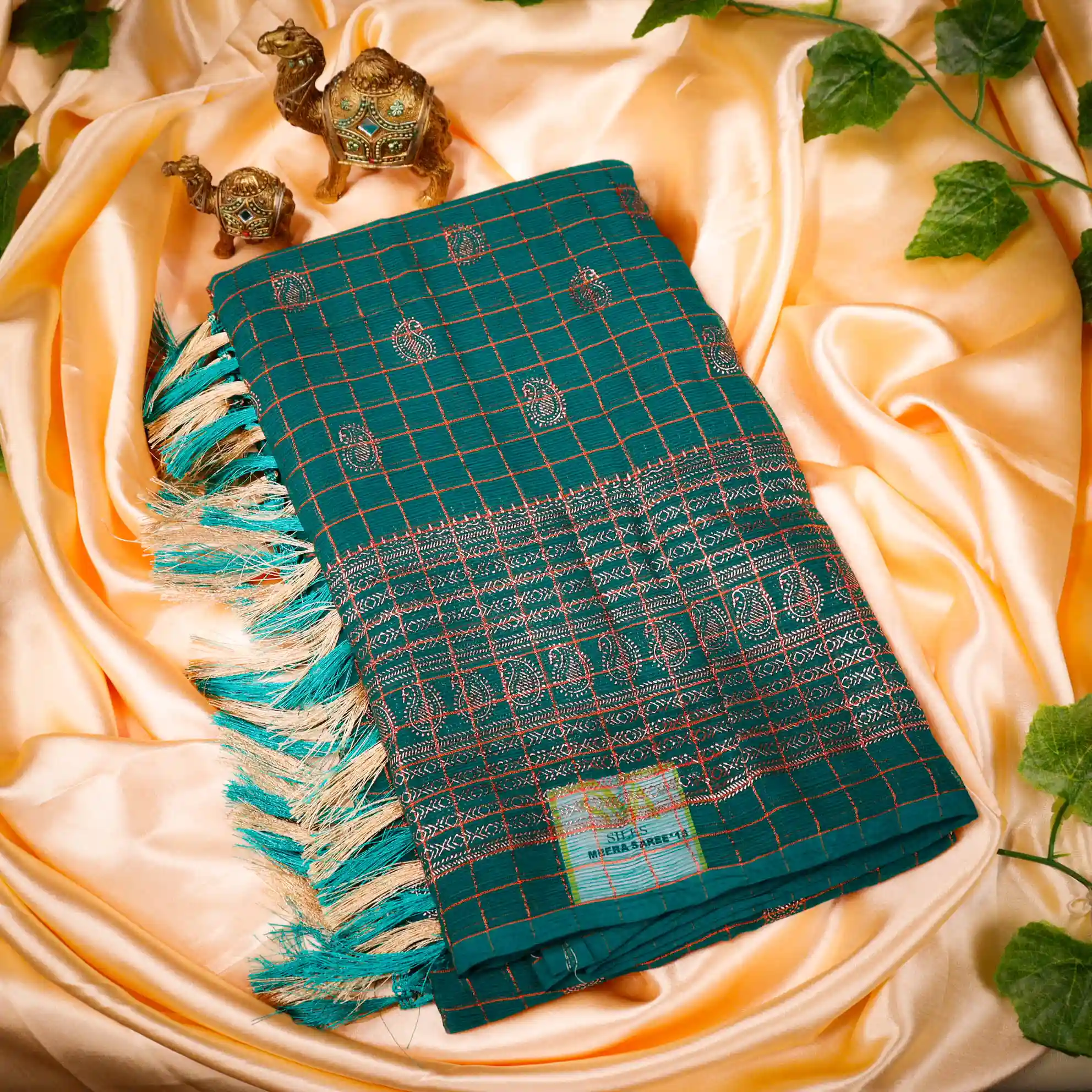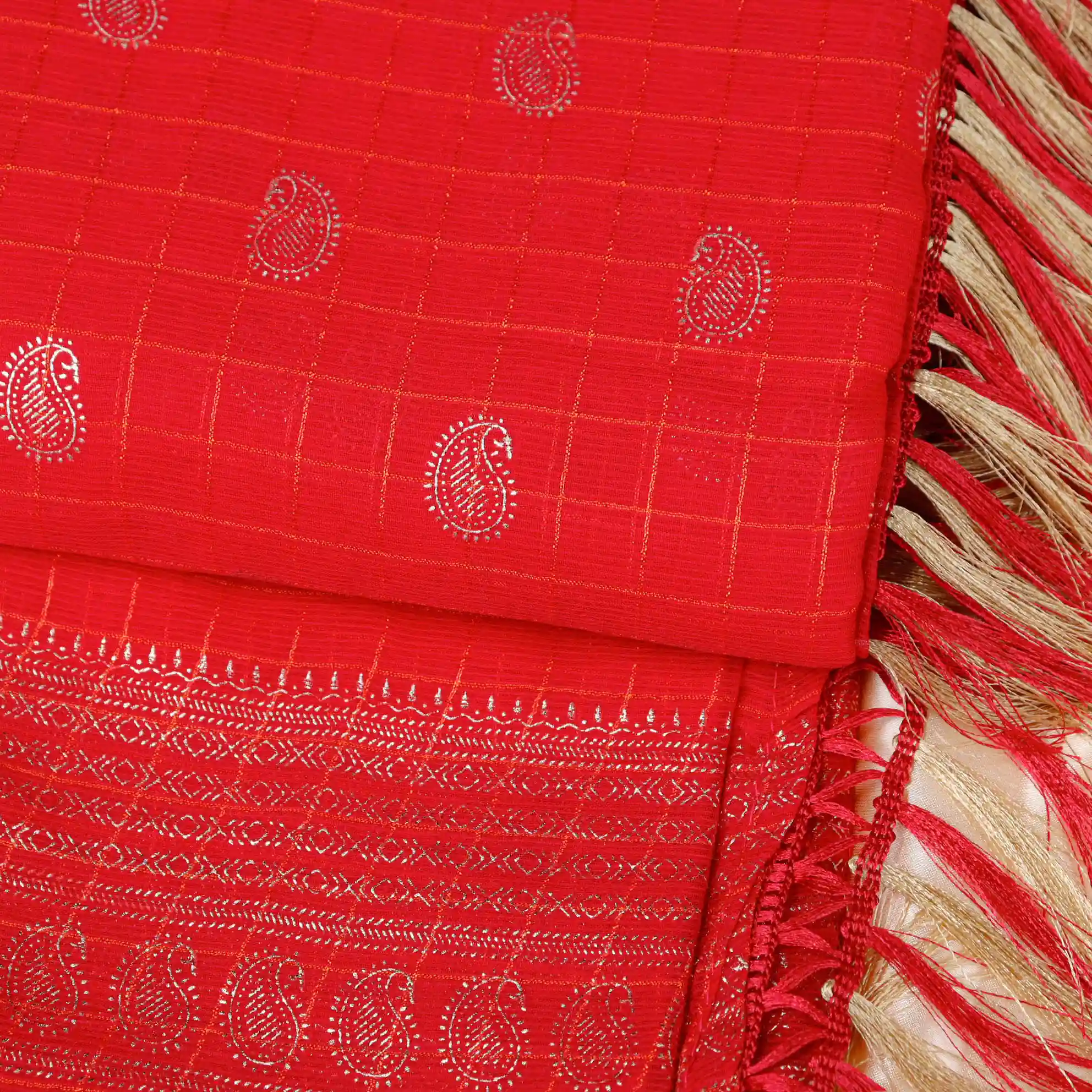 Available in a refreshing Green and Red Colour Combination, the saree is beautifully finished with Tassel knot detailing at the Pallu end, adding a graceful touch to its overall look. It comes with a 0.80 m running blouse, making it a perfect choice for casual outings, small gatherings, and daily ethnic wear.