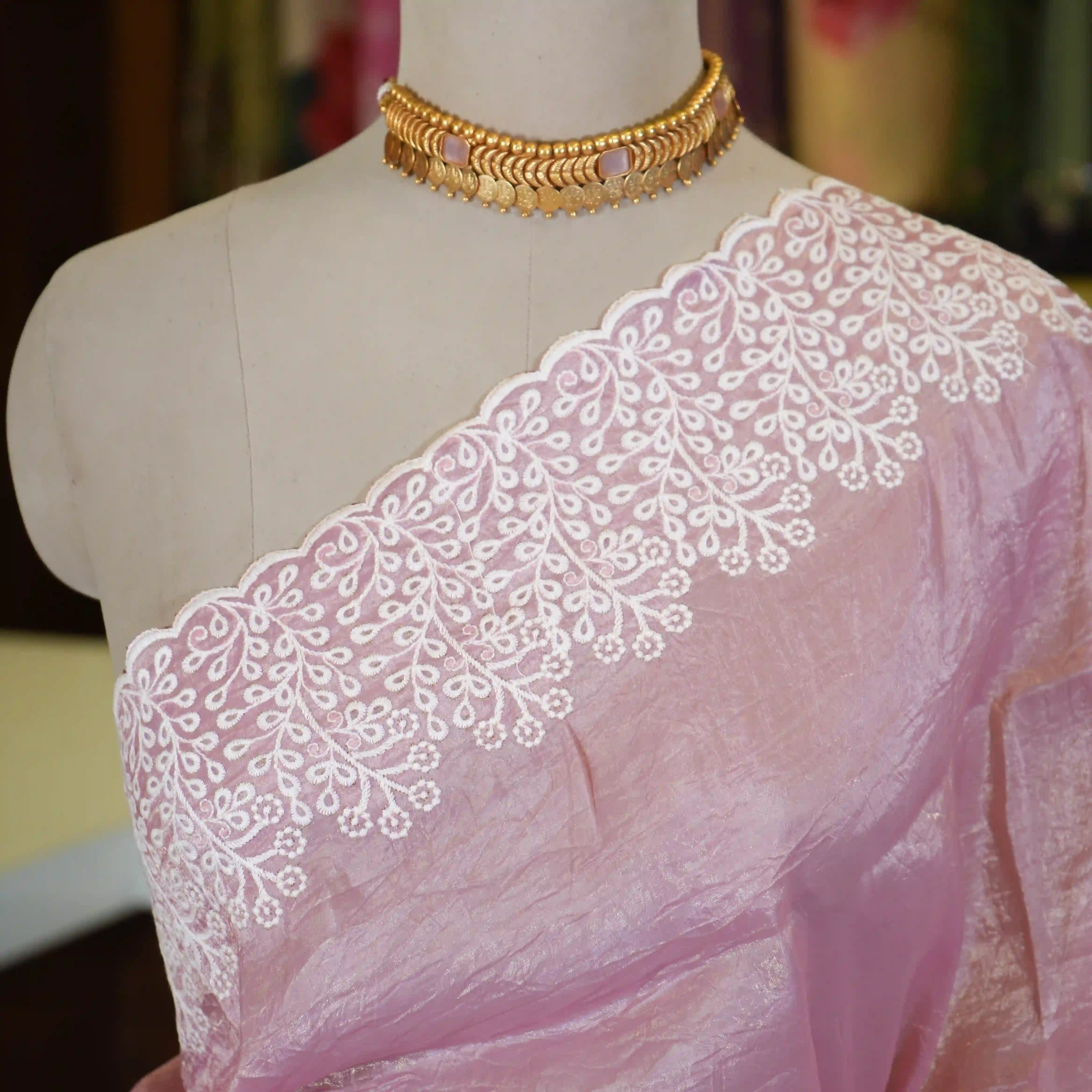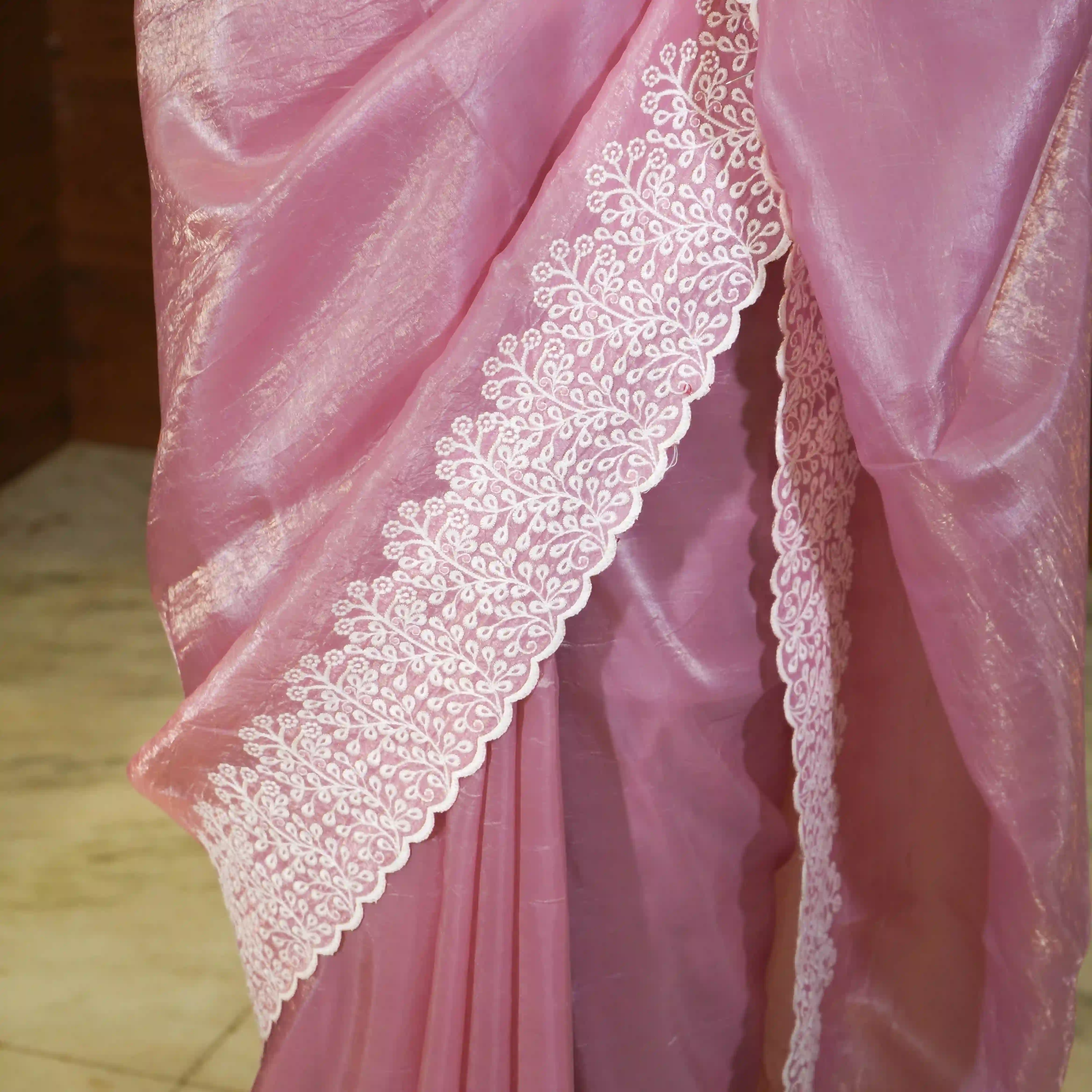 The saree is beautifully detailed with a delicate white embroidery border and neatly finished scallop edges, giving it a refined and feminine touch. It comes with a 0.80 meter blouse piece adorned with beautiful flower embroidery details, allowing you to create a perfectly coordinated ensemble.