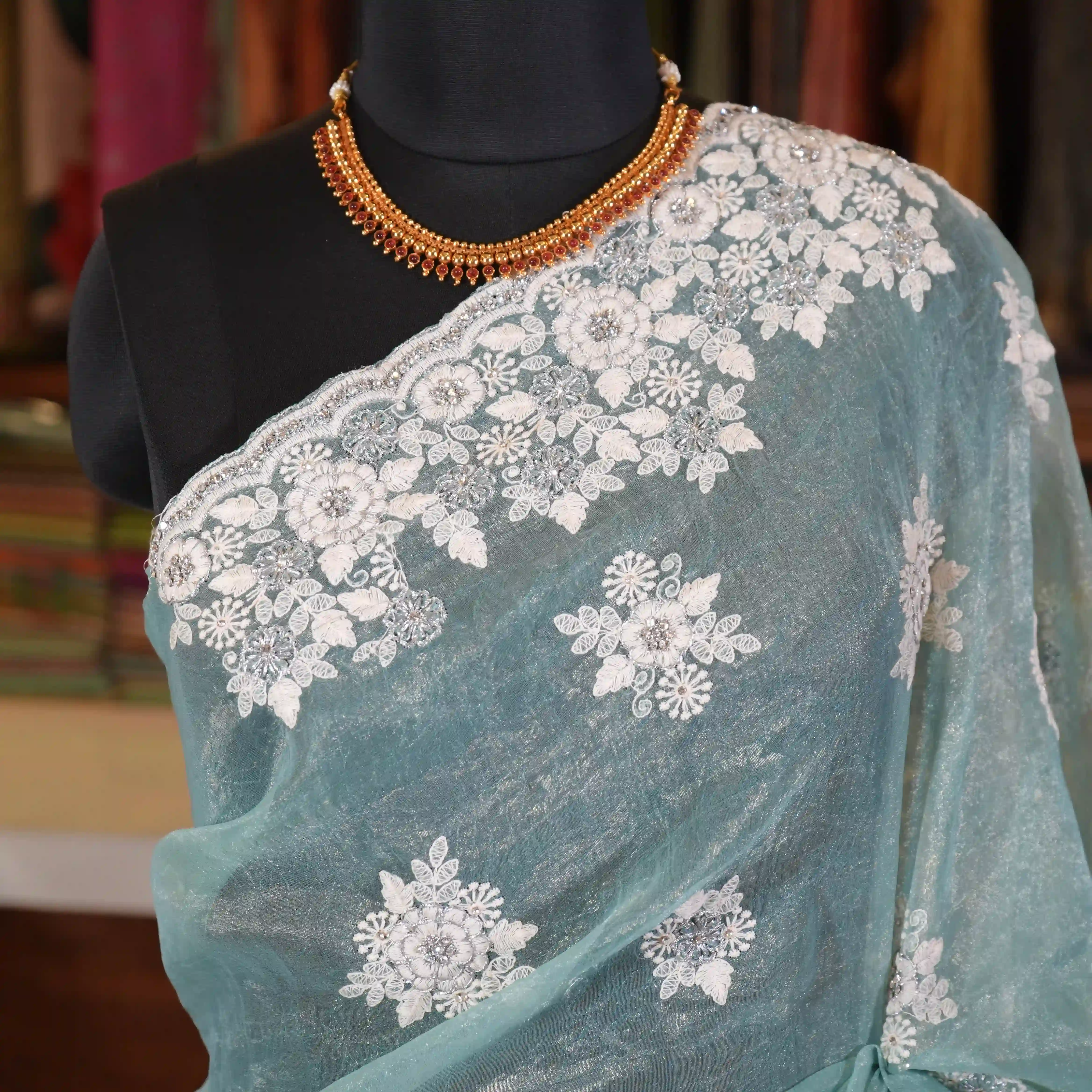 This is a beautiful organza saree adorned with delicate applique work designs that add artistic detail and richness to the overall look. The saree is further enhanced with elegant white embroidery detailing along its border, giving it a refined and classy finish.