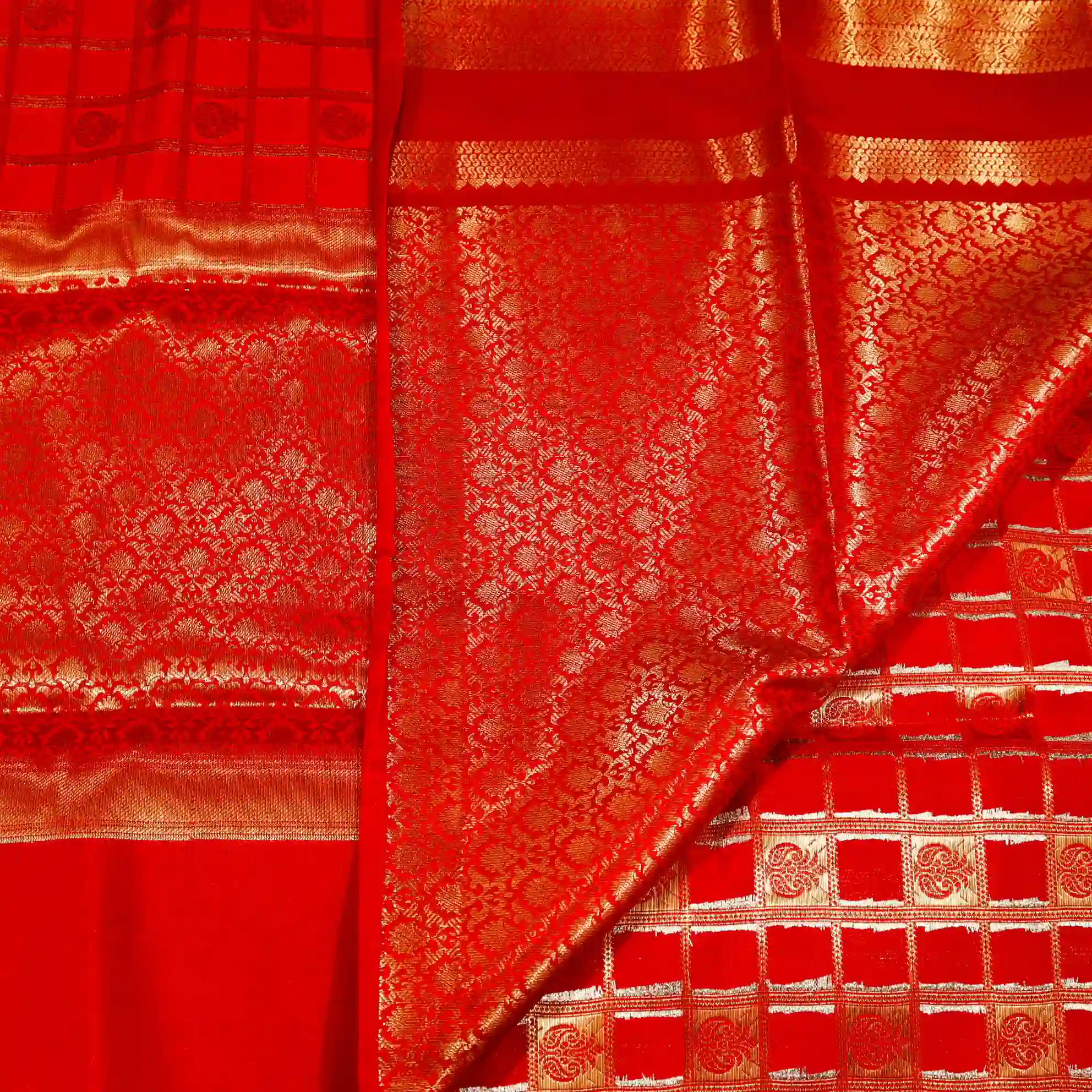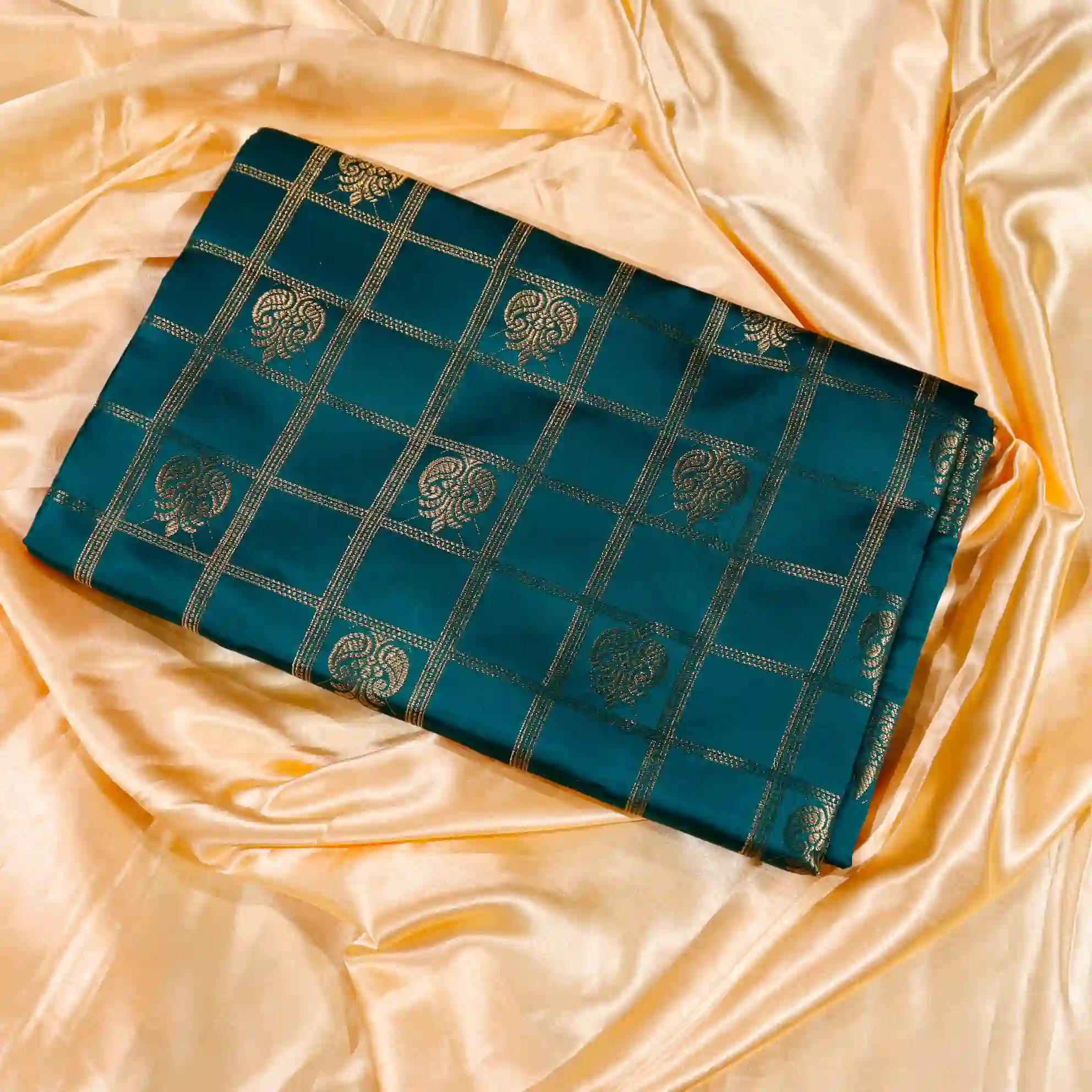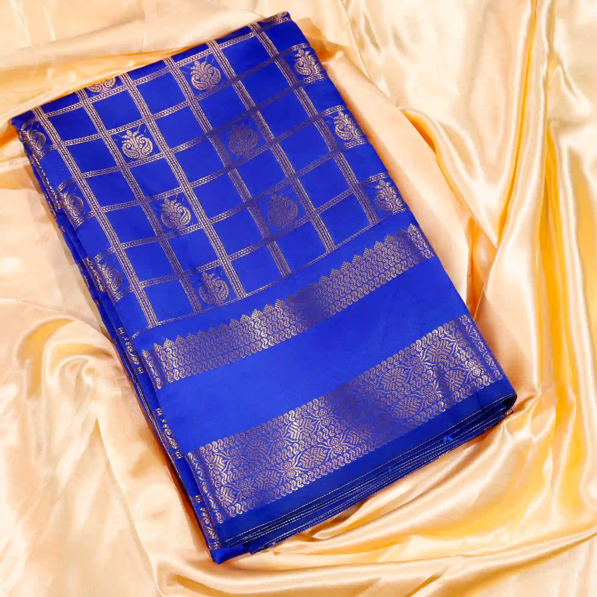 This saree features a classic checked pattern, giving it a sophisticated and graceful appeal. The fine weaving and subtle sheen add a royal touch, making it suitable for both festive occasions and traditional gatherings.