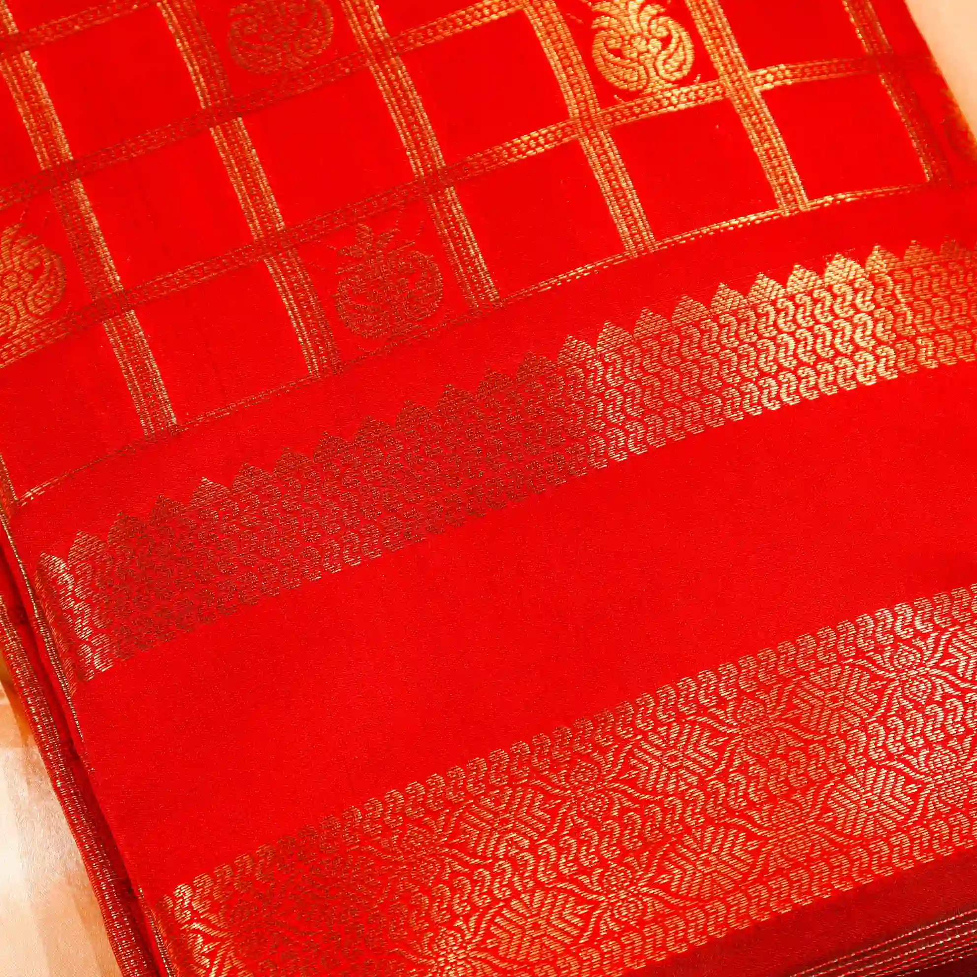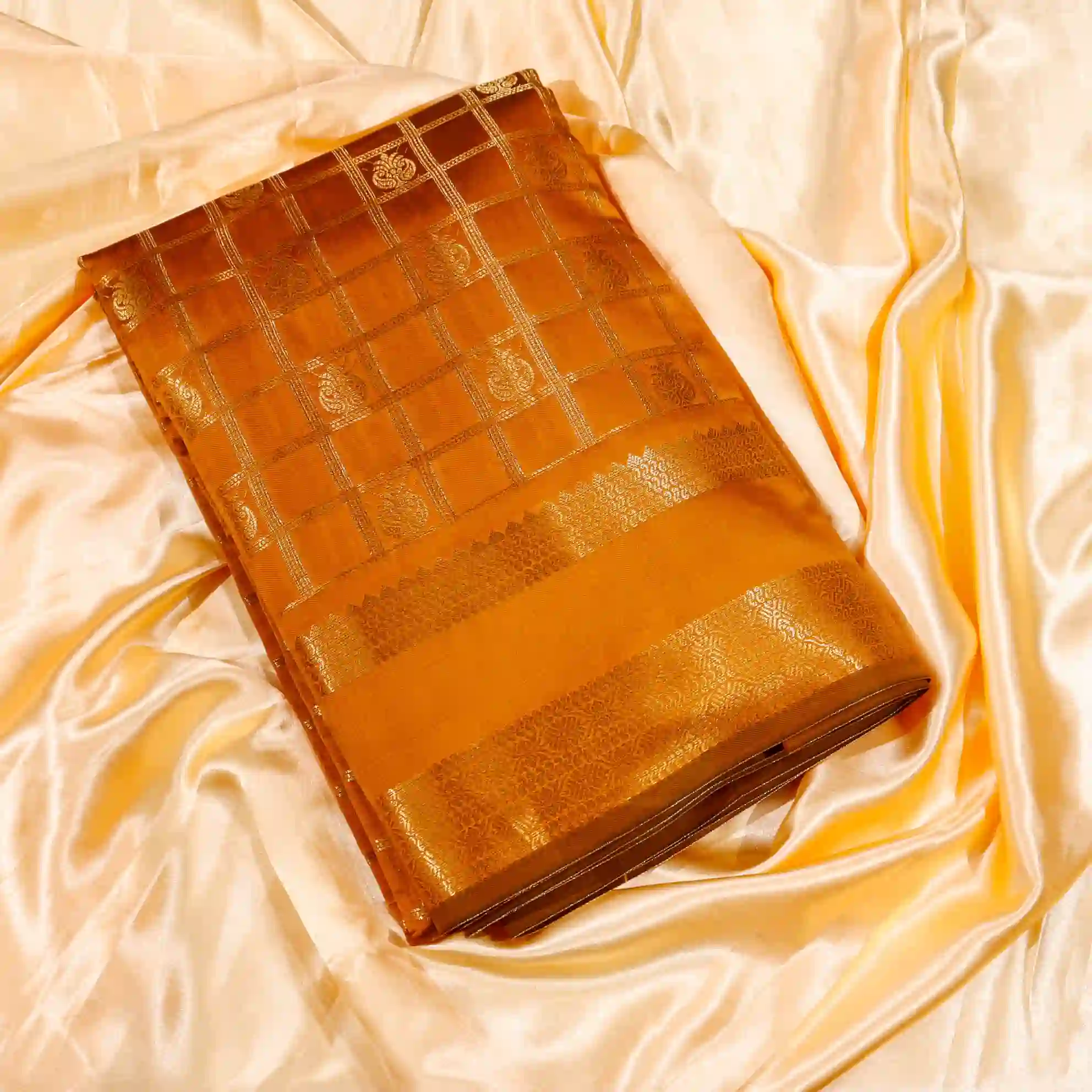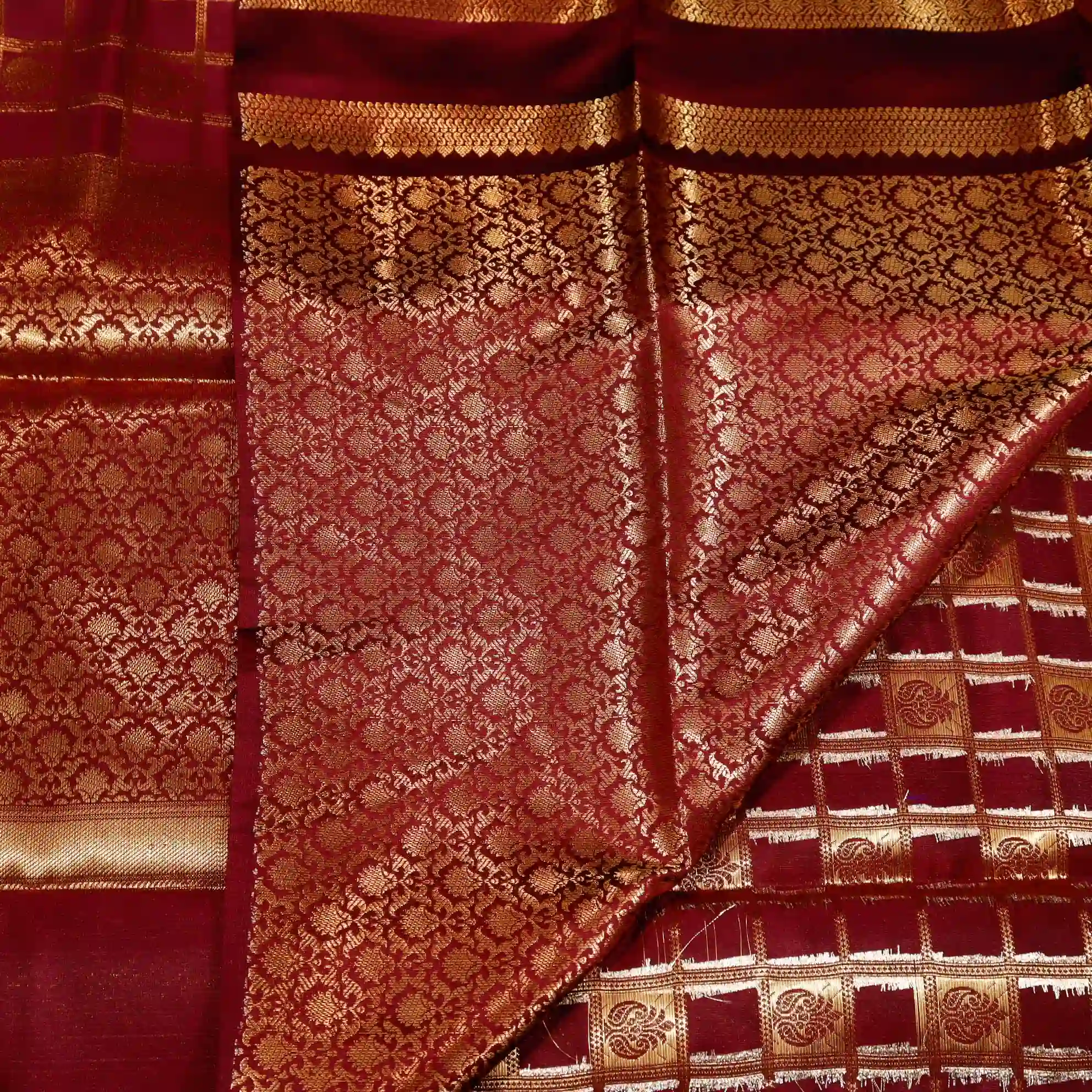 This saree features a classic checked pattern, giving it a sophisticated and graceful appeal. The fine weaving and subtle sheen add a royal touch, making it suitable for both festive occasions and traditional gatherings.