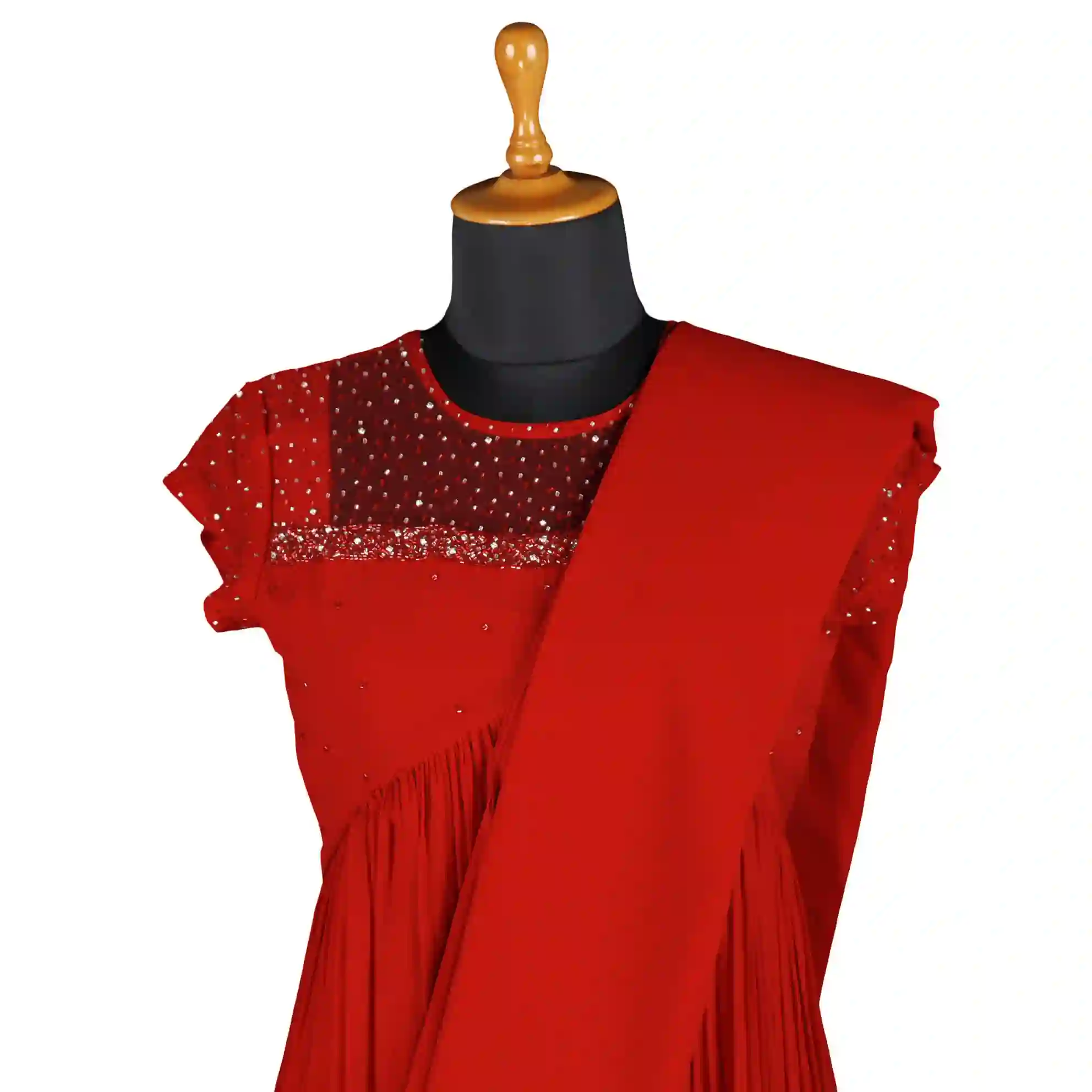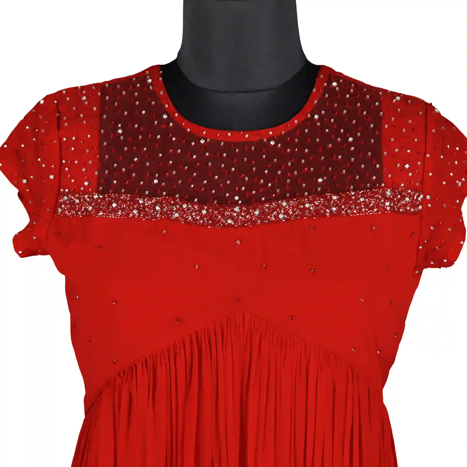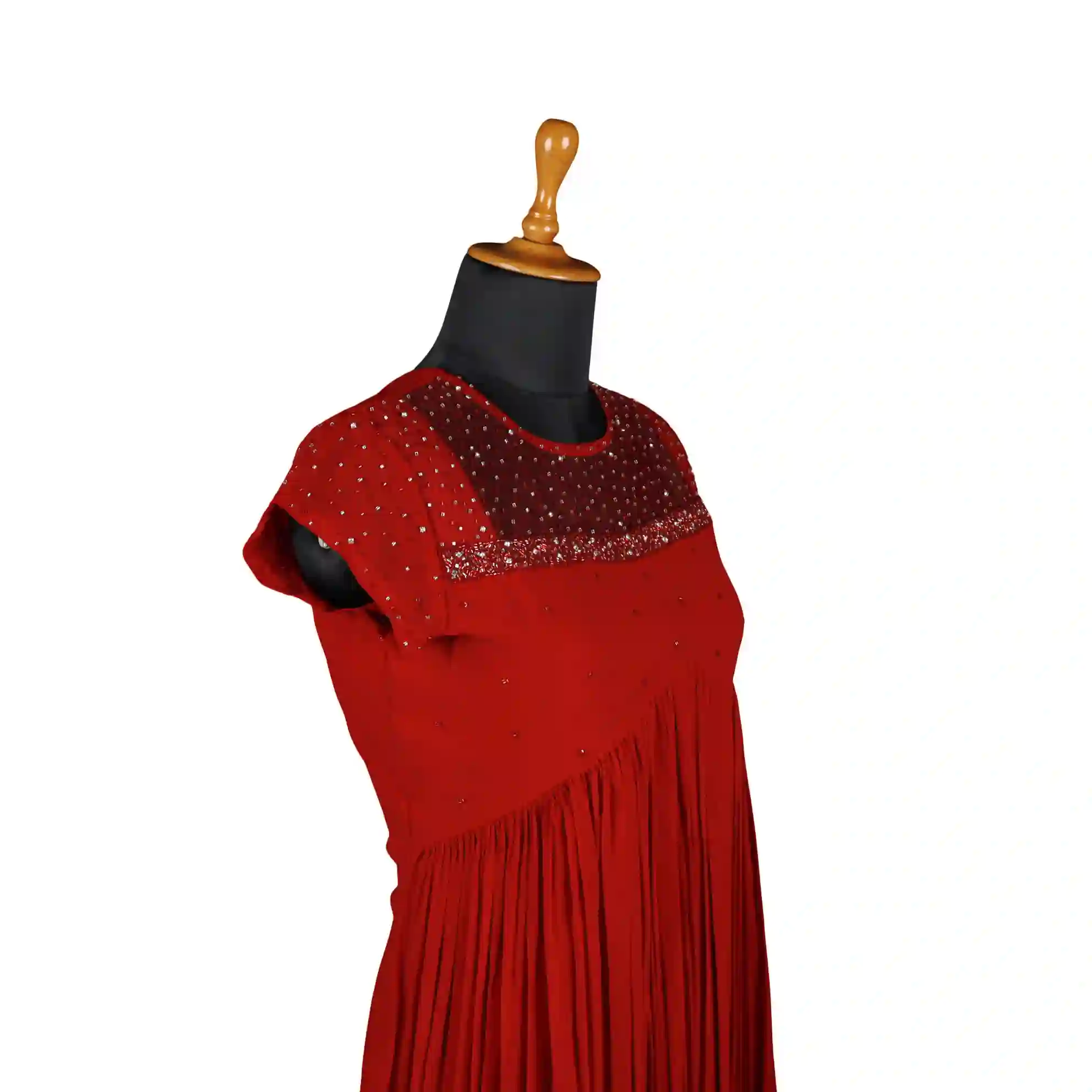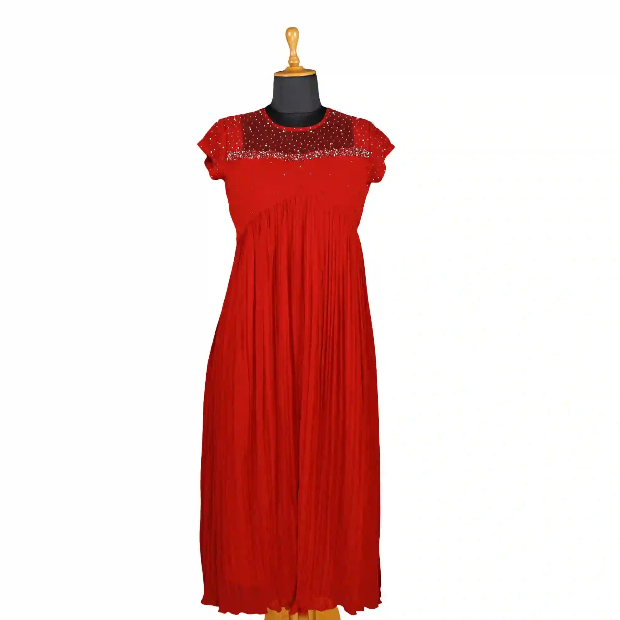 The highlight of this outfit is its netted neckline adorned with delicate bead work, adding a touch of sparkle and sophistication. The A-line pleated design enhances the overall silhouette, making it flattering for different body types.
