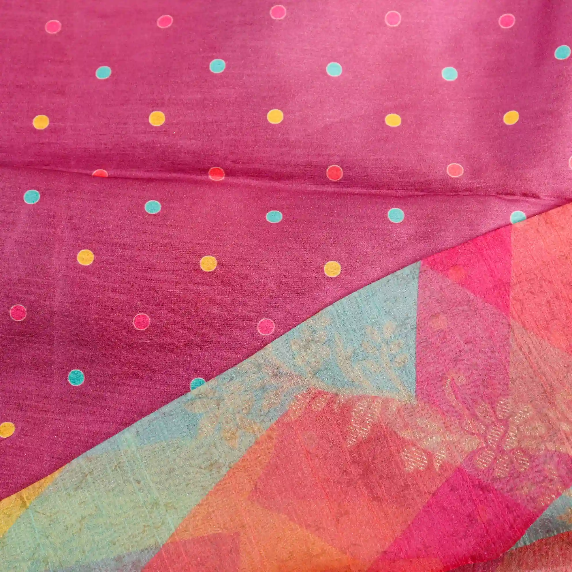 The saree body features artistic coral-themed prints in a multicolour palette, creating a fresh, lively, and eye-catching look. Its modern design makes it perfect for occasions, parties, and trend-focused styling.