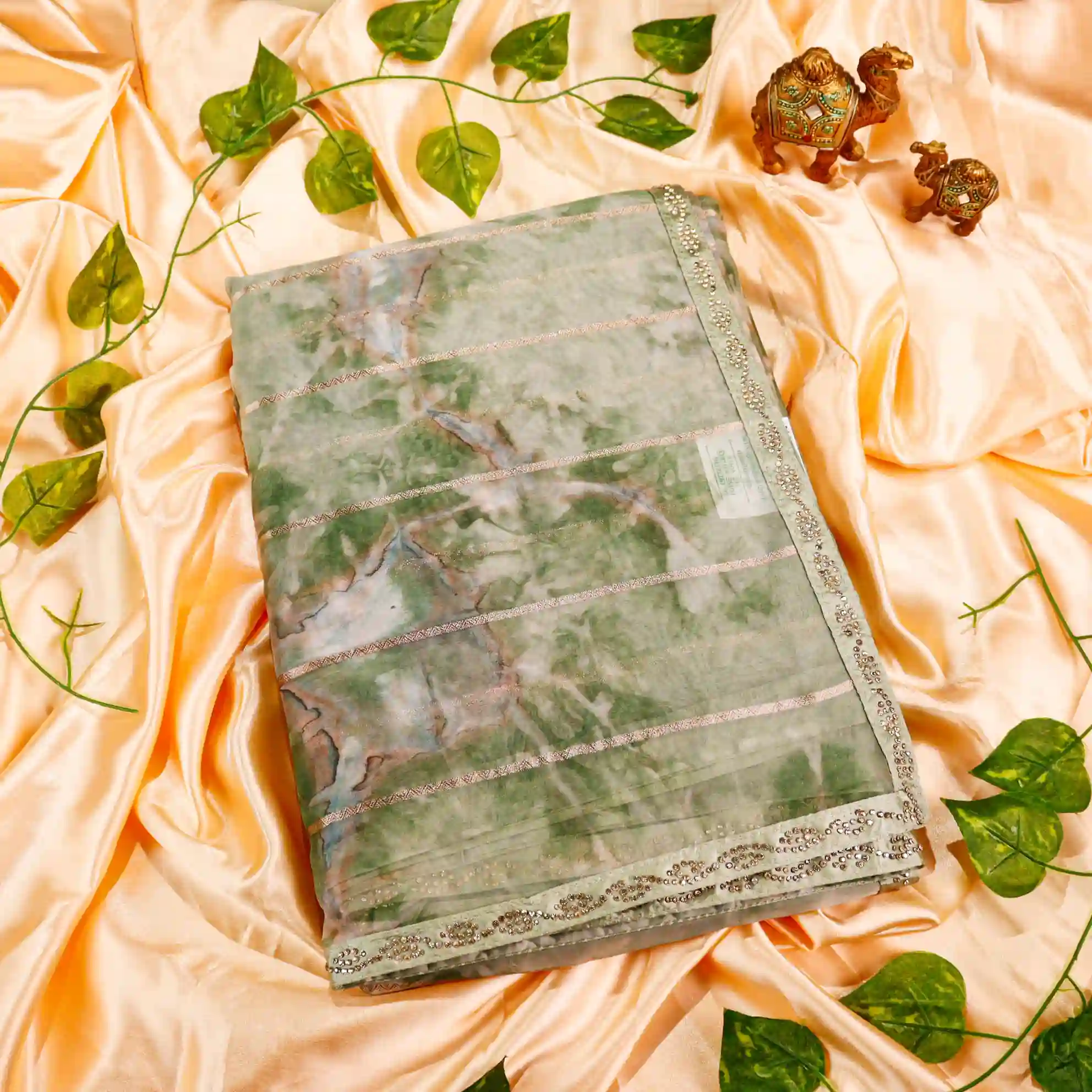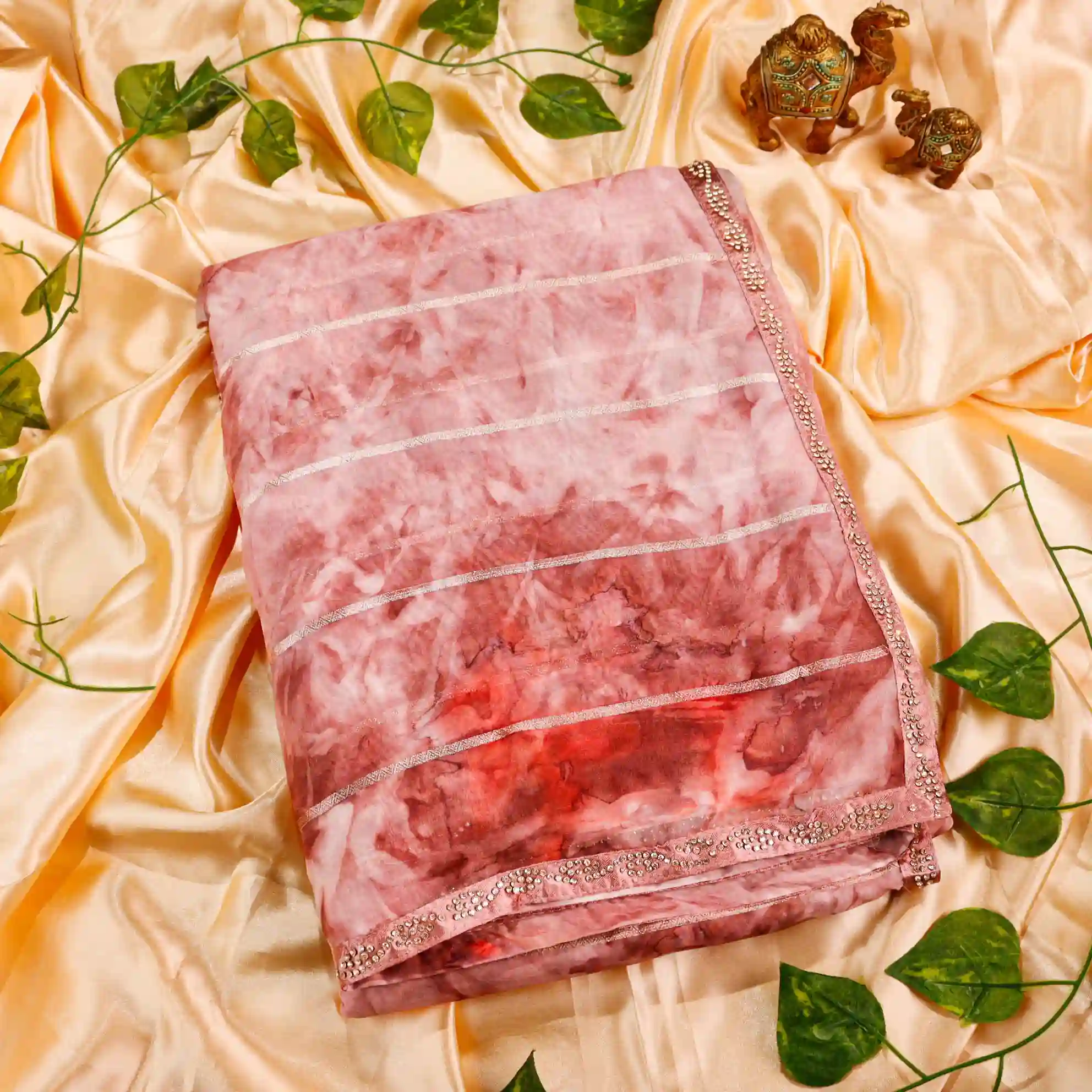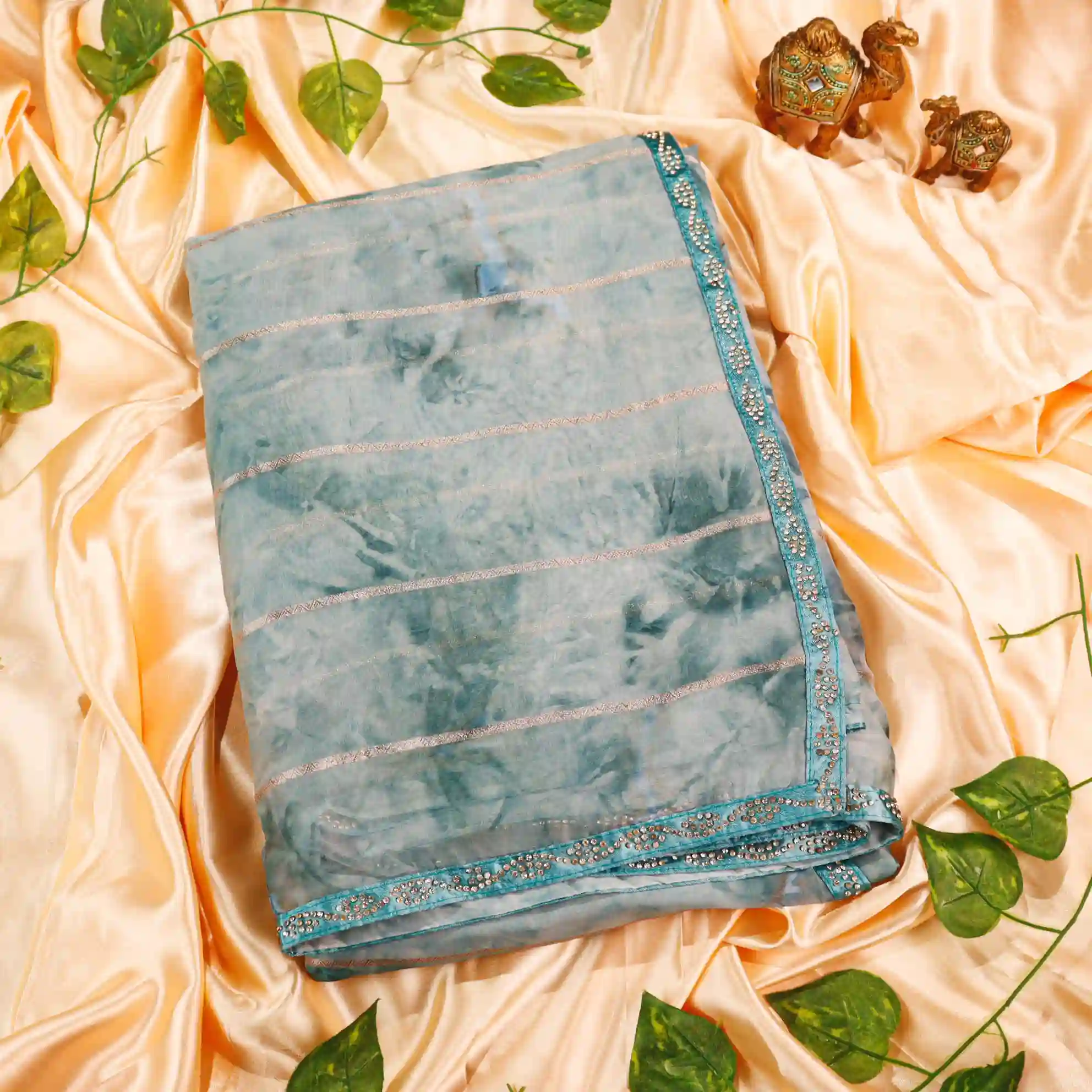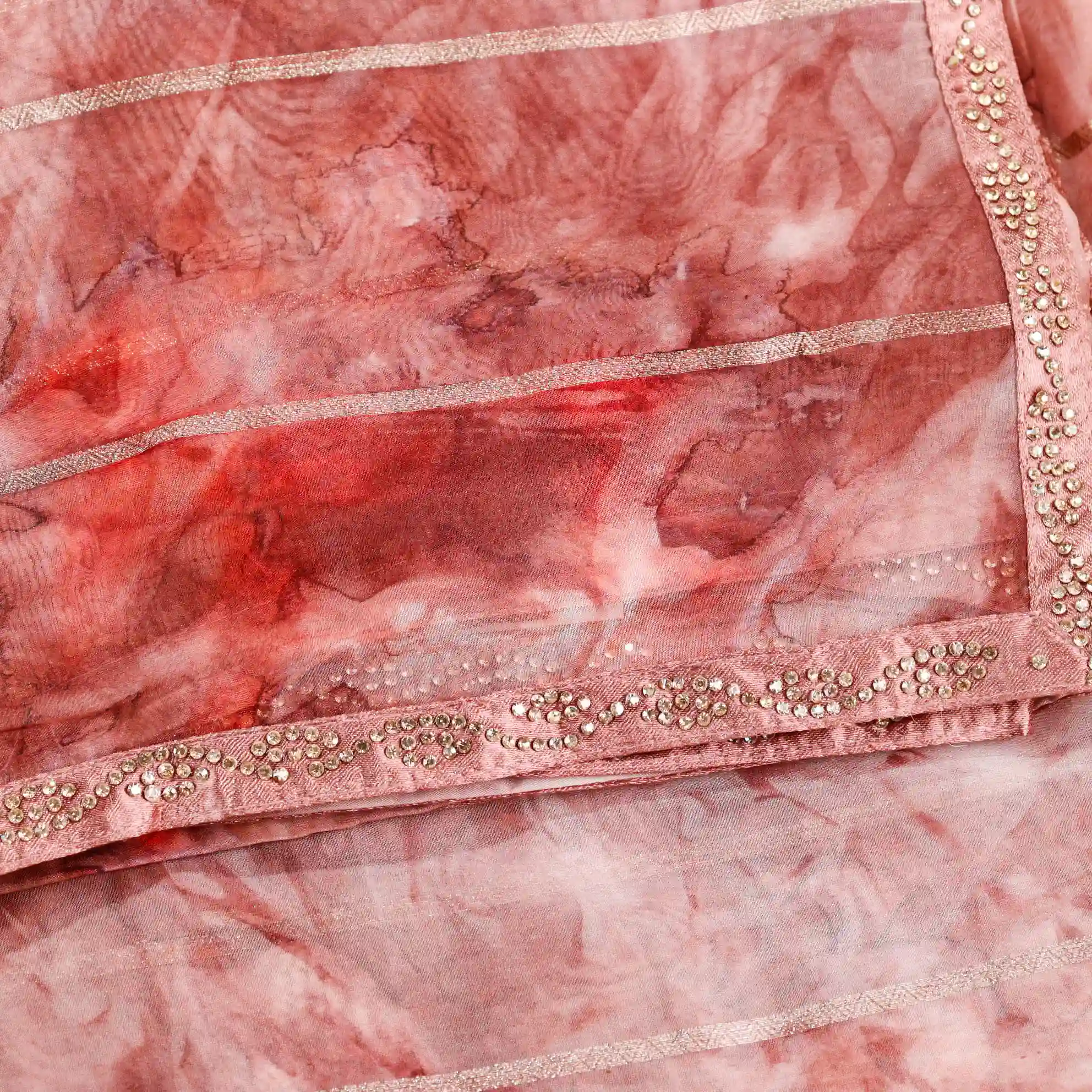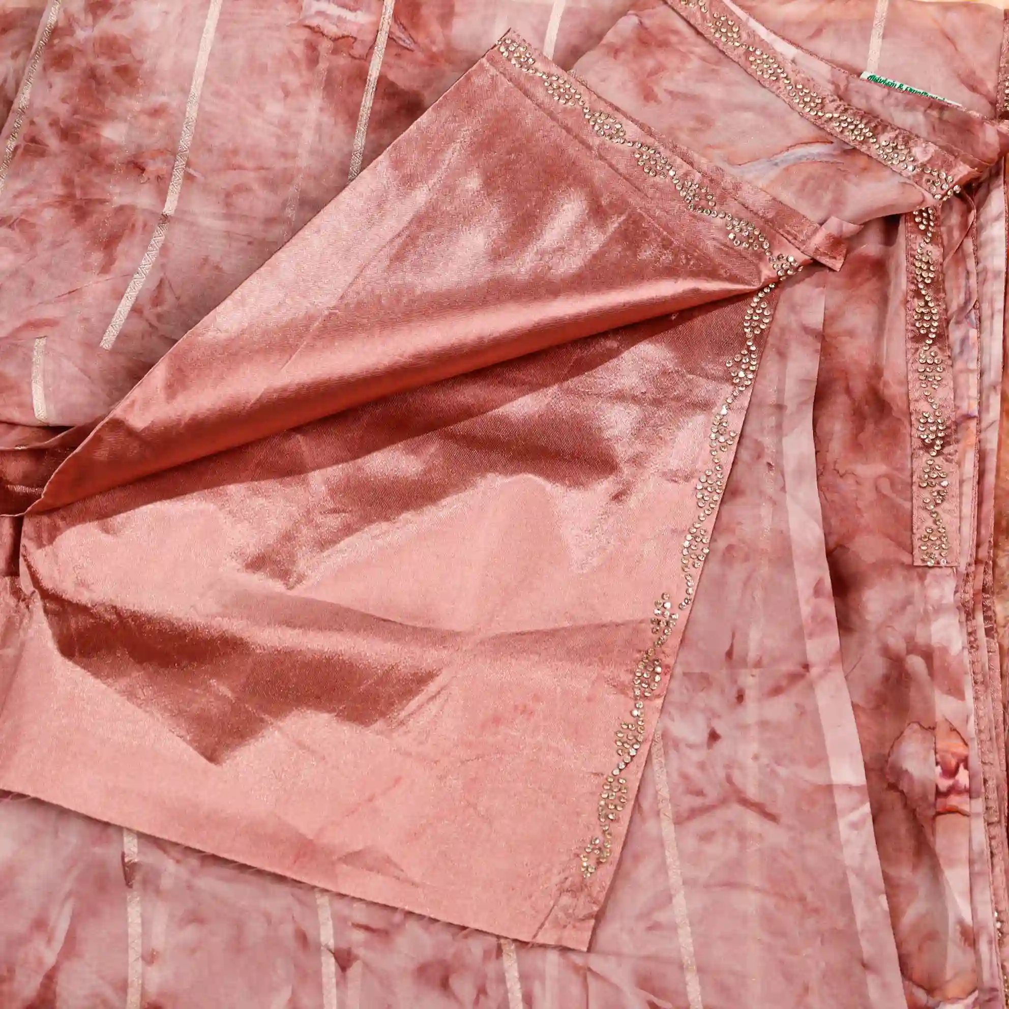 It comes paired with a plain soft tissue satin blouse measuring 0.80 meters, enhanced with gold stone work detailing on the sleeves, completing the look with a rich and polished finish.