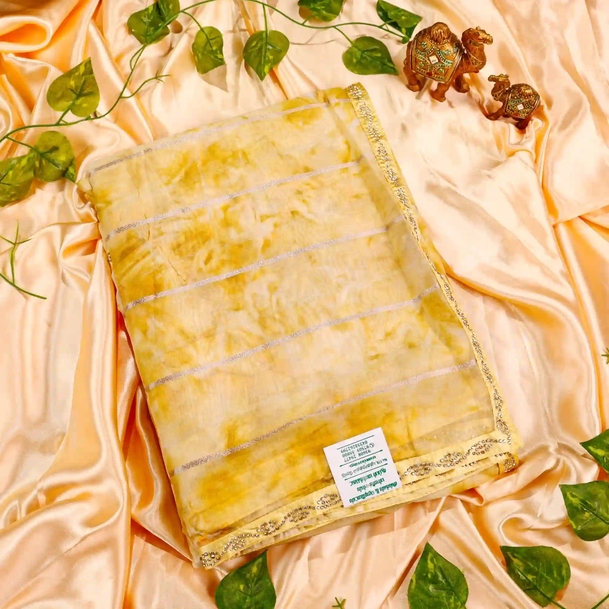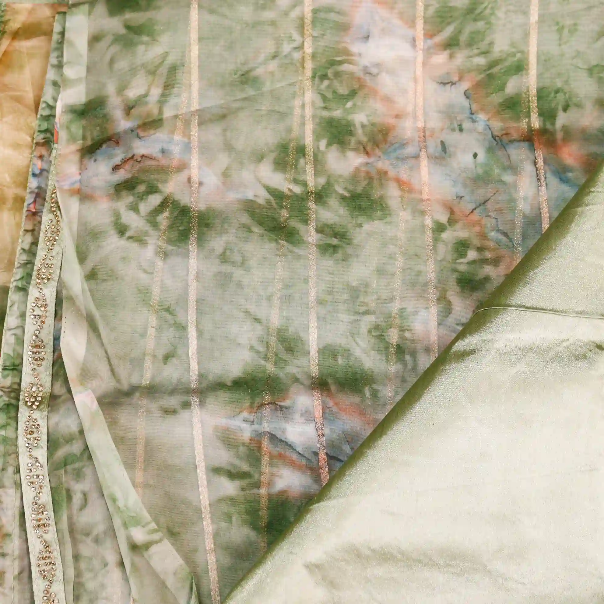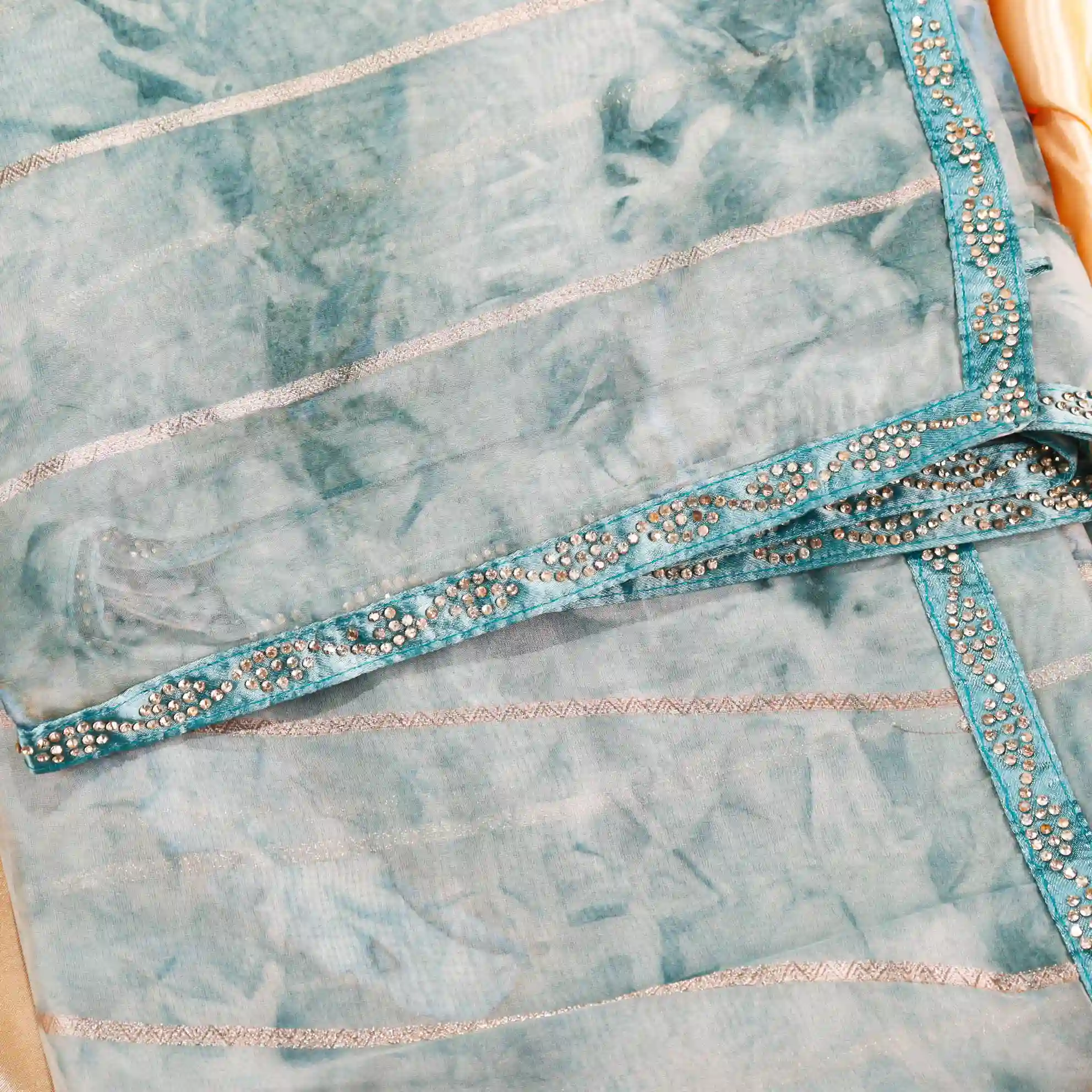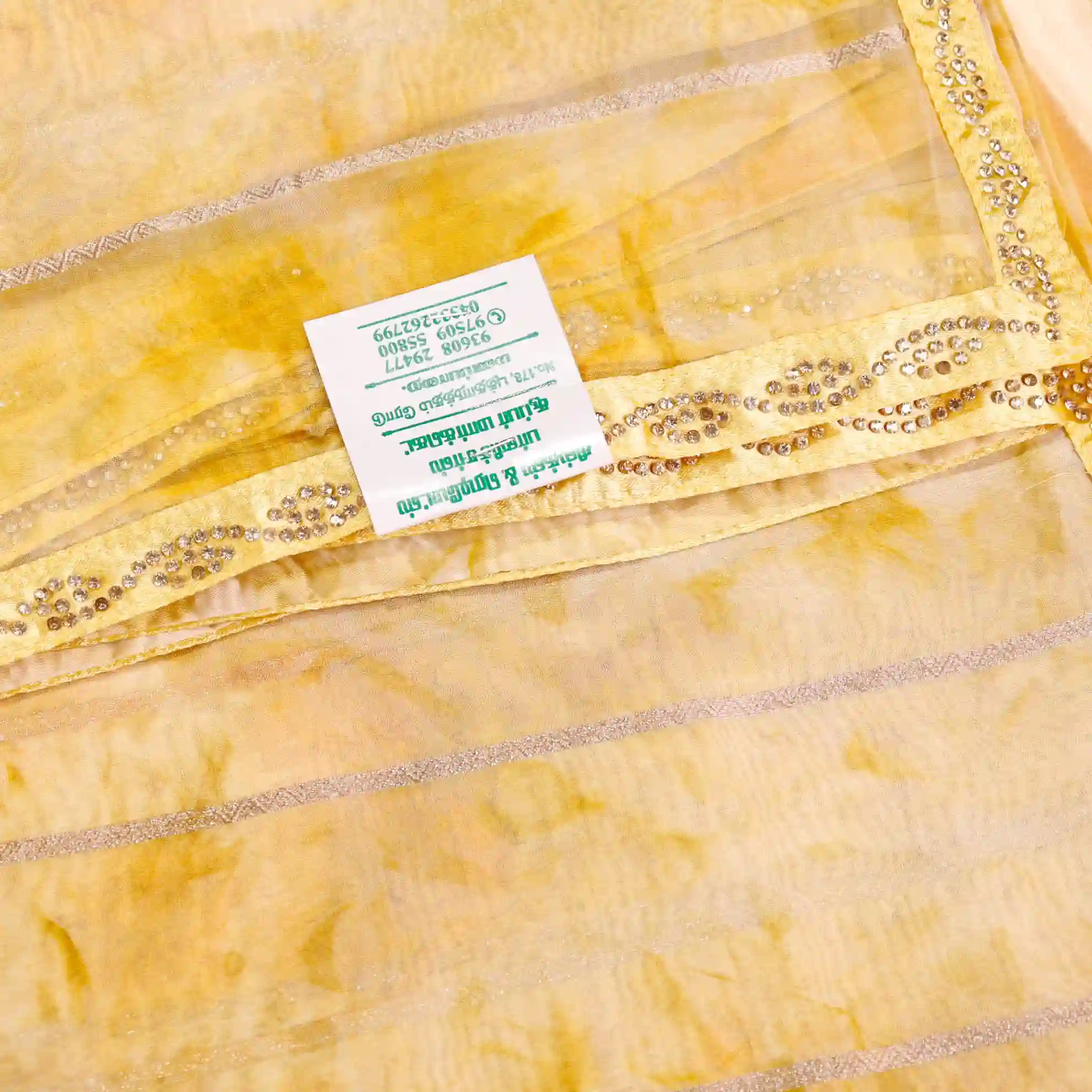 It comes paired with a plain soft tissue satin blouse measuring 0.80 meters, enhanced with gold stone work detailing on the sleeves, completing the look with a rich and polished finish.