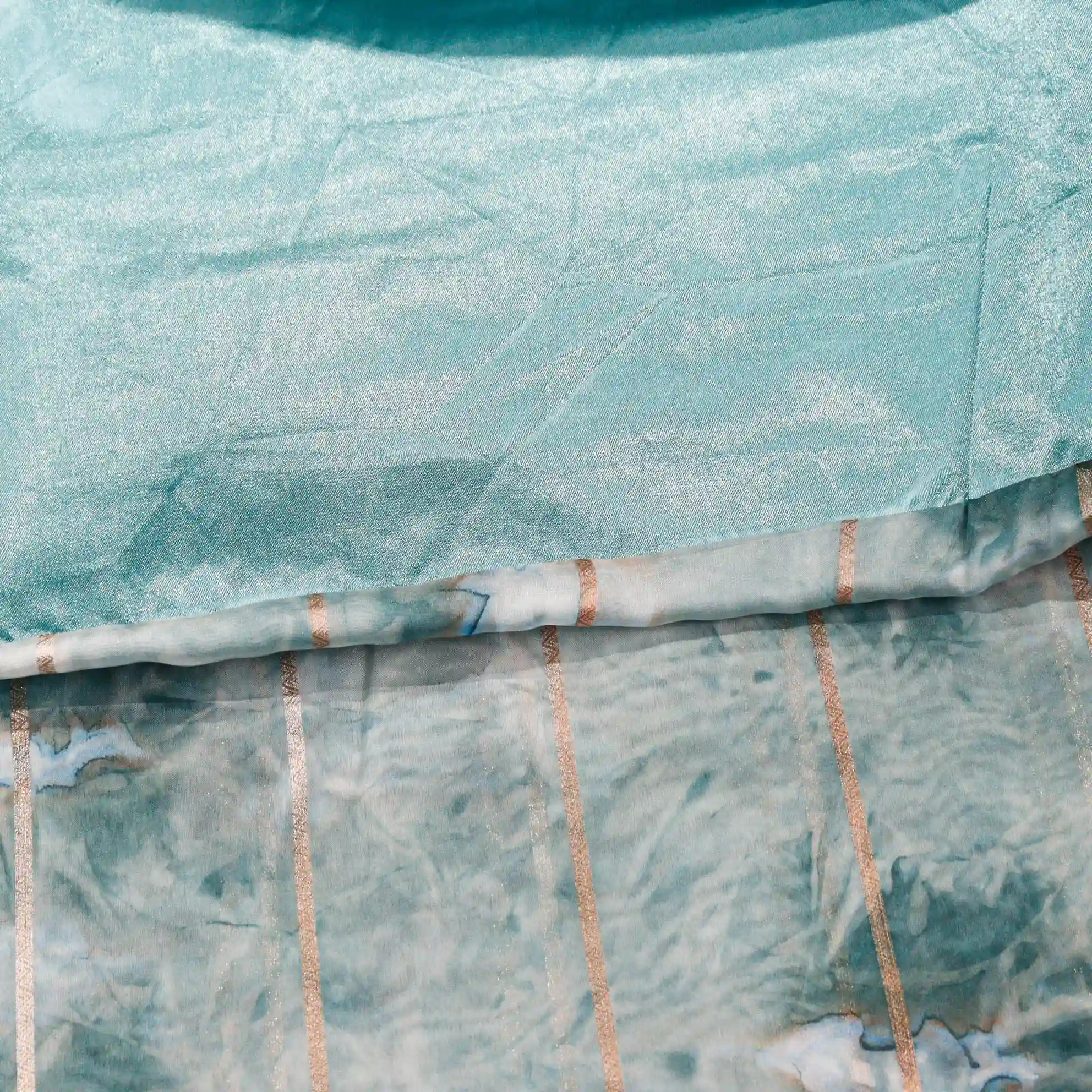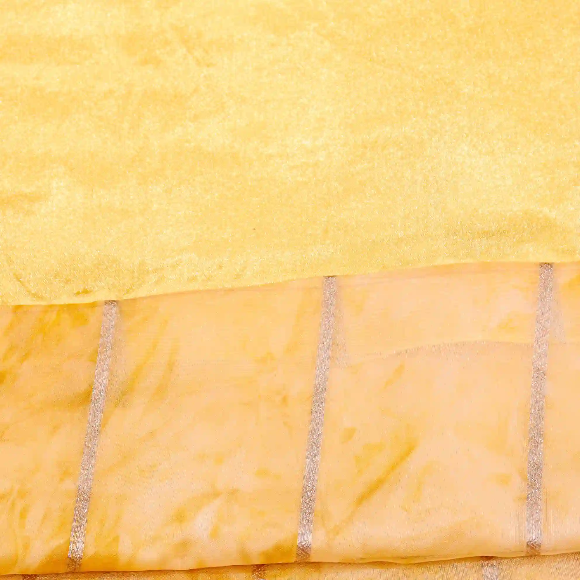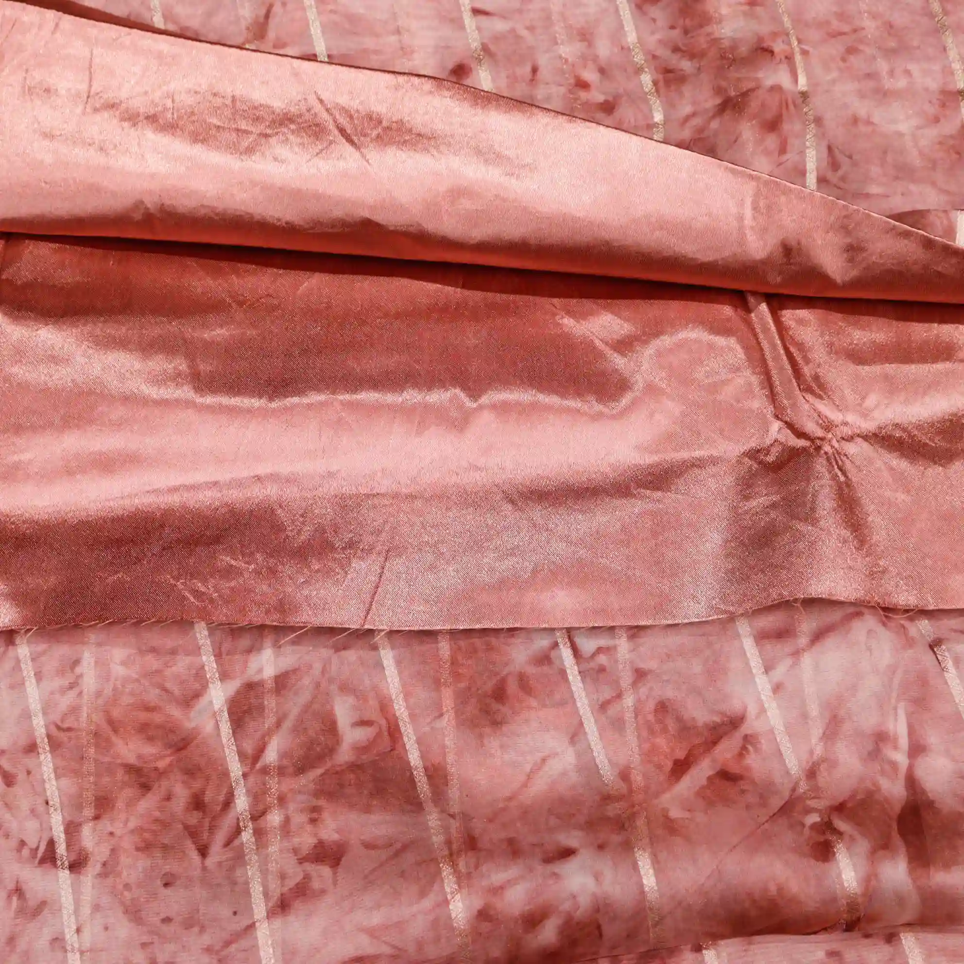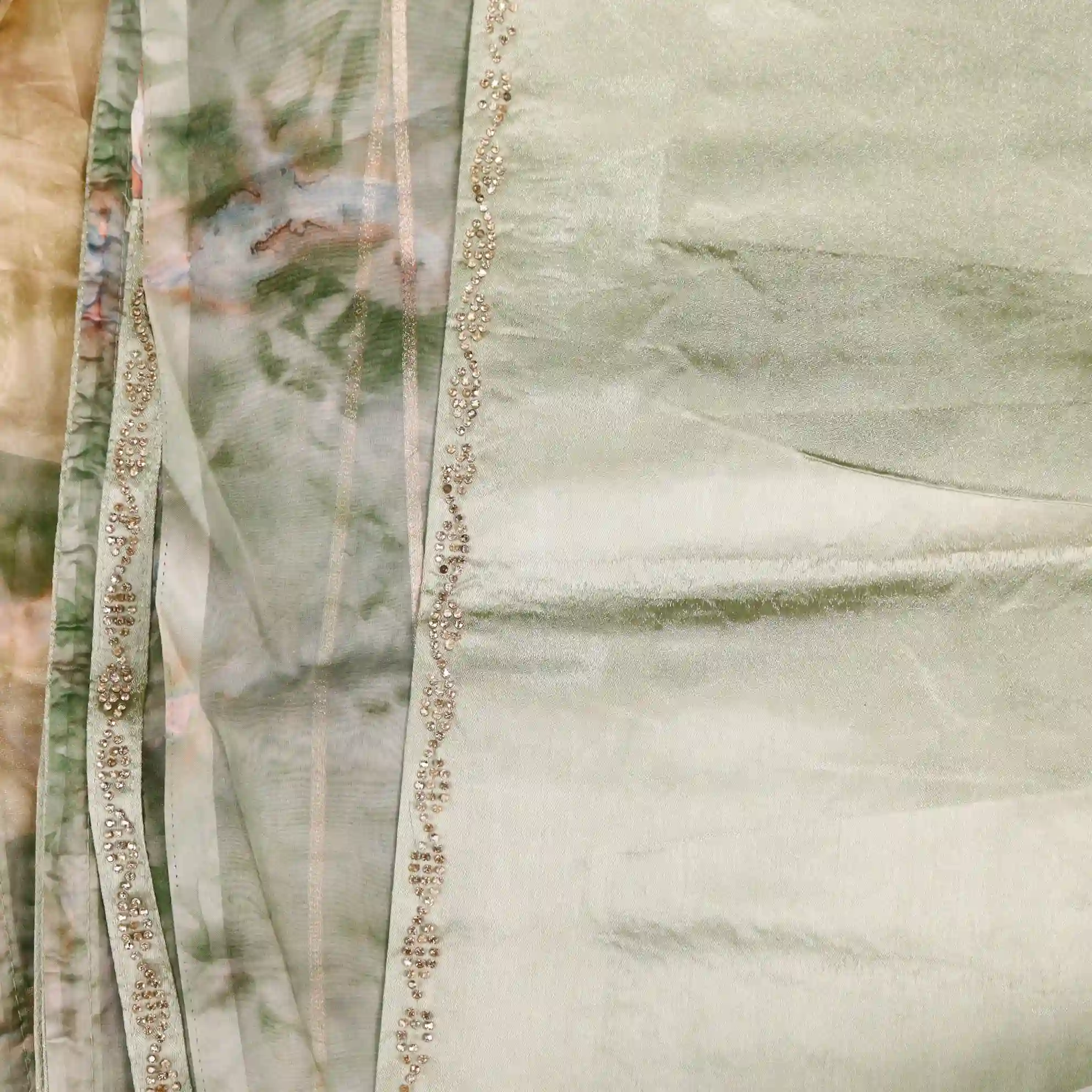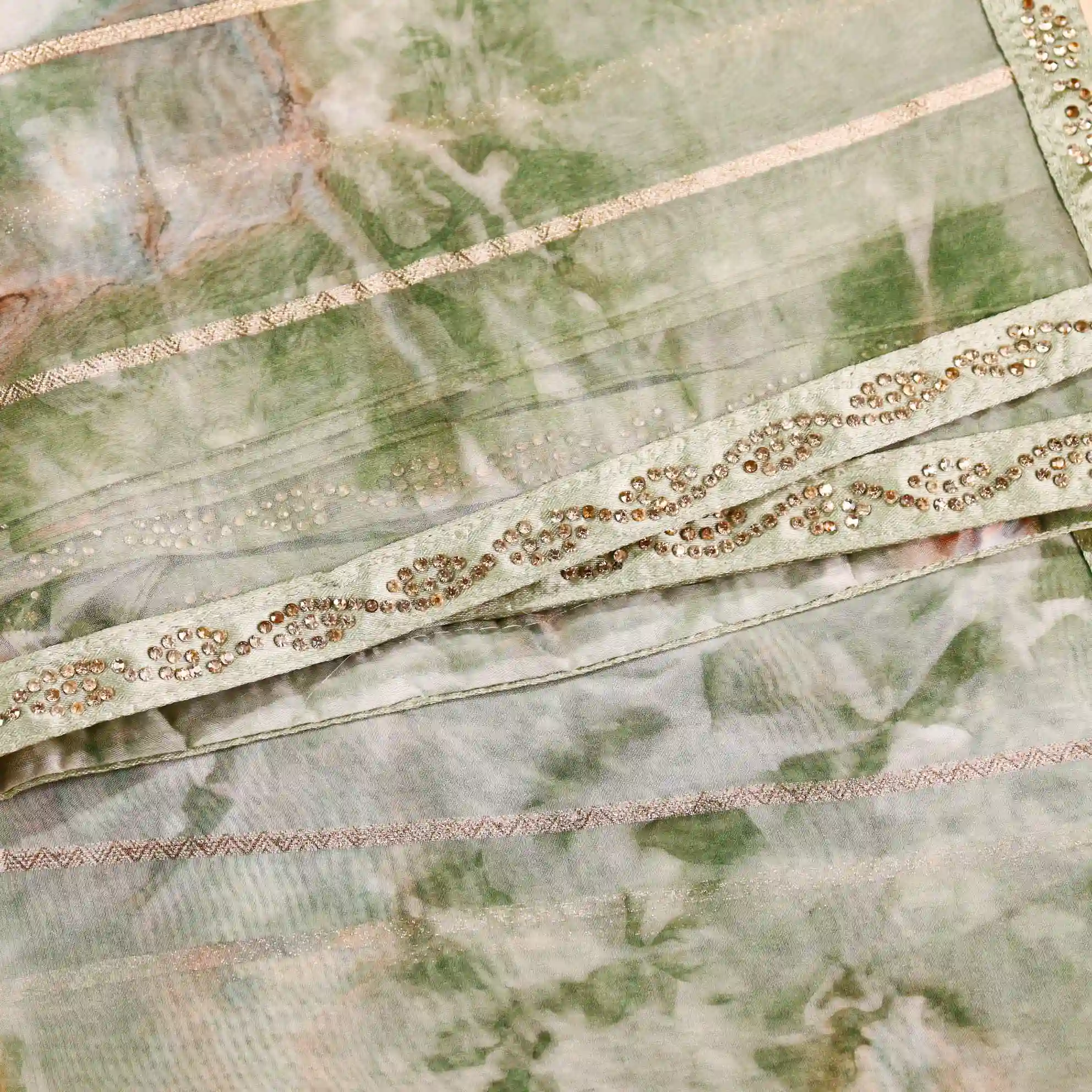 It comes paired with a plain soft tissue satin blouse measuring 0.80 meters, enhanced with gold stone work detailing on the sleeves, completing the look with a rich and polished finish.