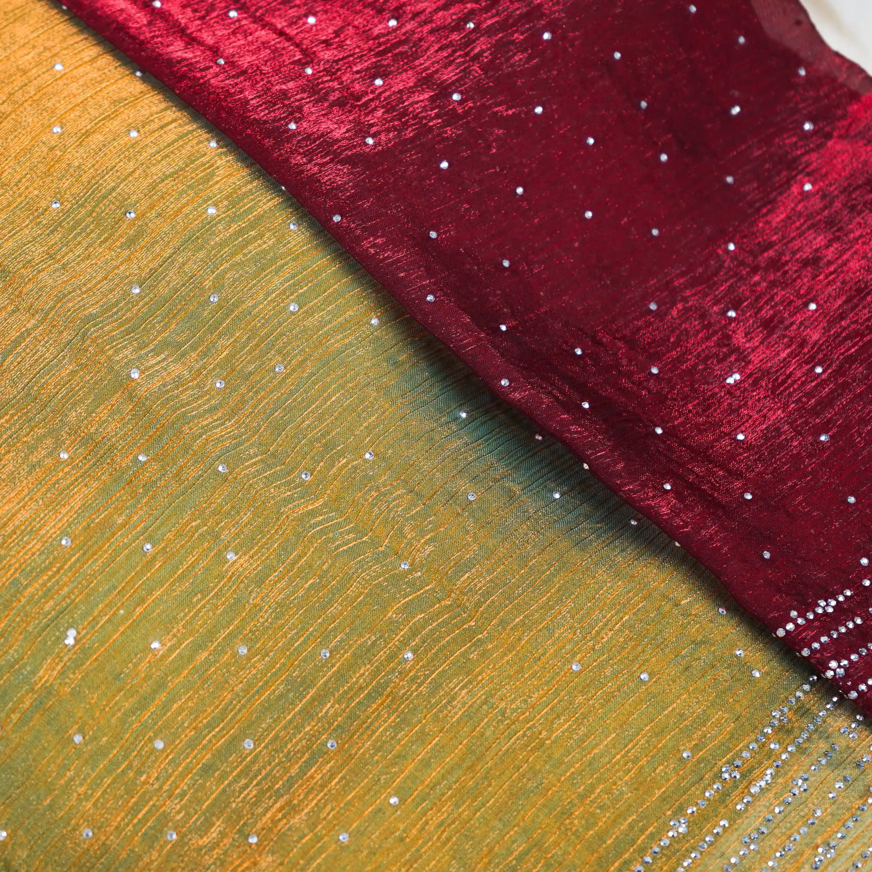 crafted to highlight rich colors and graceful detailing. The saree showcases a warm golden-olive body enhanced with delicate stone highlights, paired with a striking deep maroon pallu that adds a bold and festive contrast.