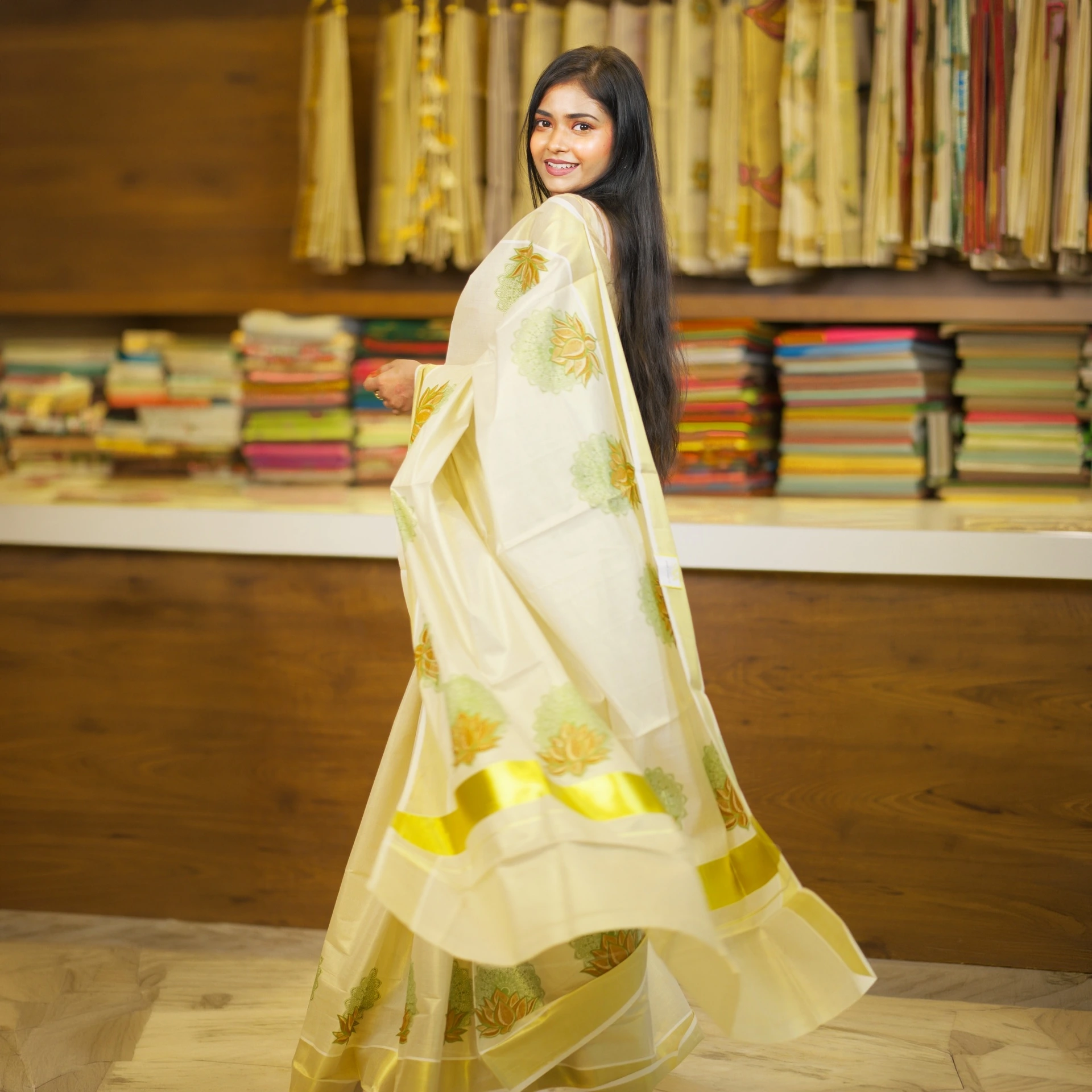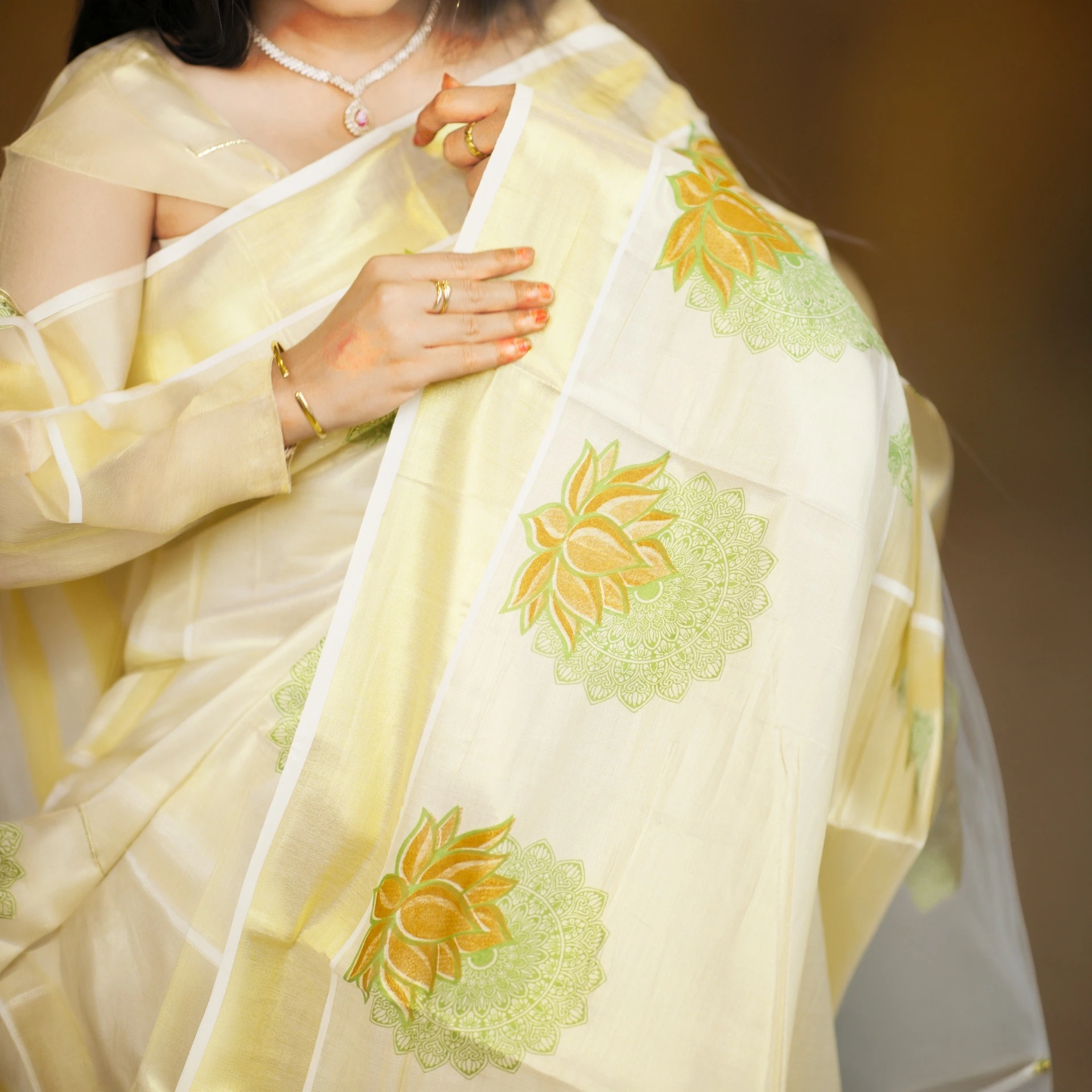 Adorned with delicate lotus butta motifs all over, the saree adds a touch of traditional charm while maintaining a modern appeal. The lightweight texture ensures a comfortable drape, making it perfect for long hours during festive occasions and celebrations.