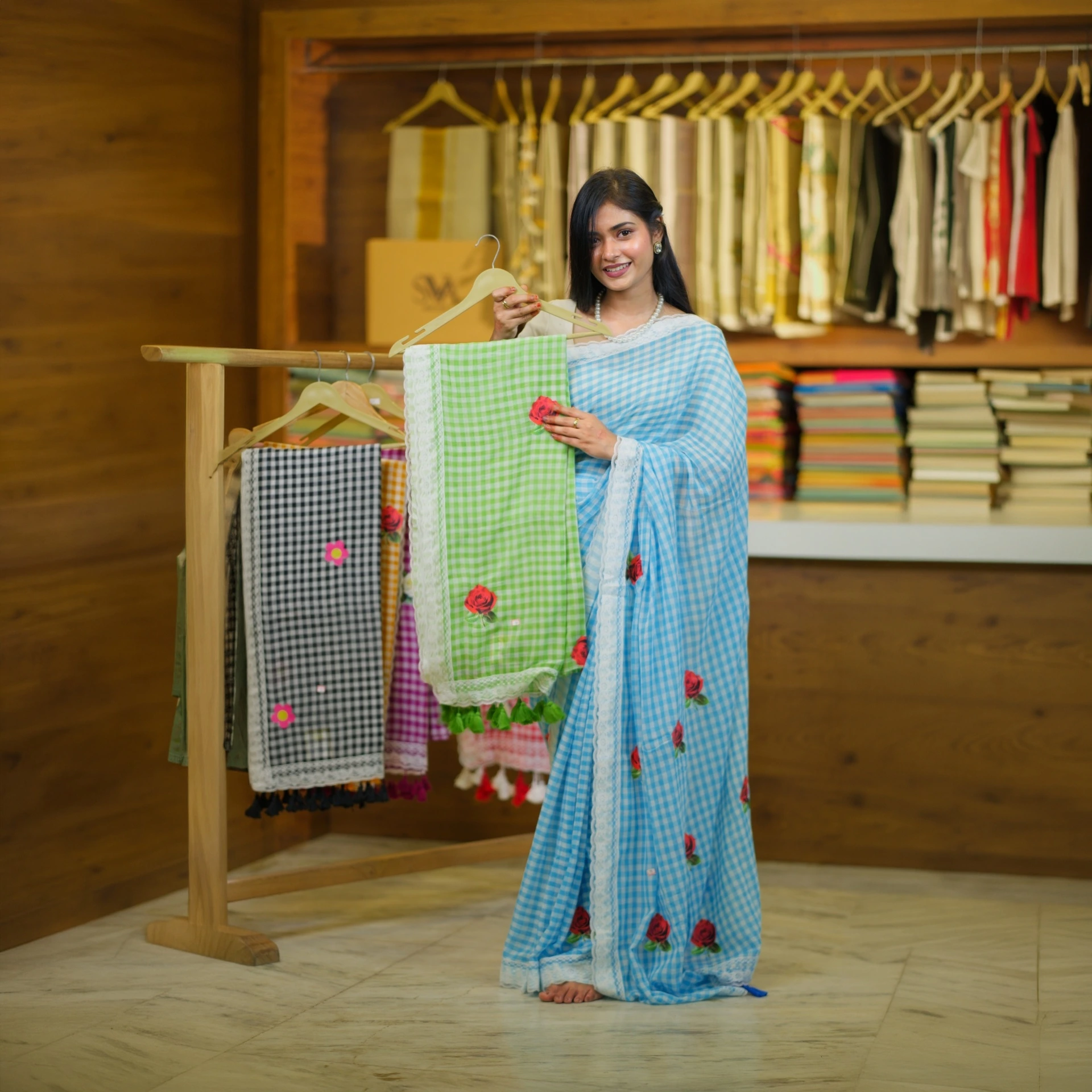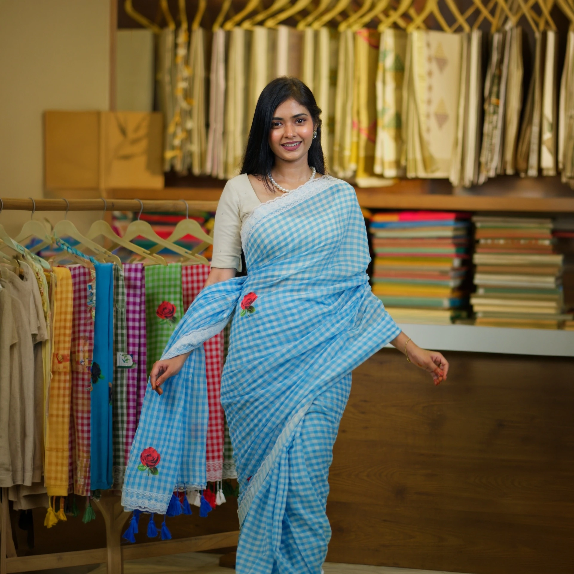 Featuring a classic checked pattern enhanced with delicate rose butta motifs, this saree blends traditional charm with a fresh, feminine touch. The look is beautifully finished with a lace work border, adding subtle elegance and uniqueness to the overall design.