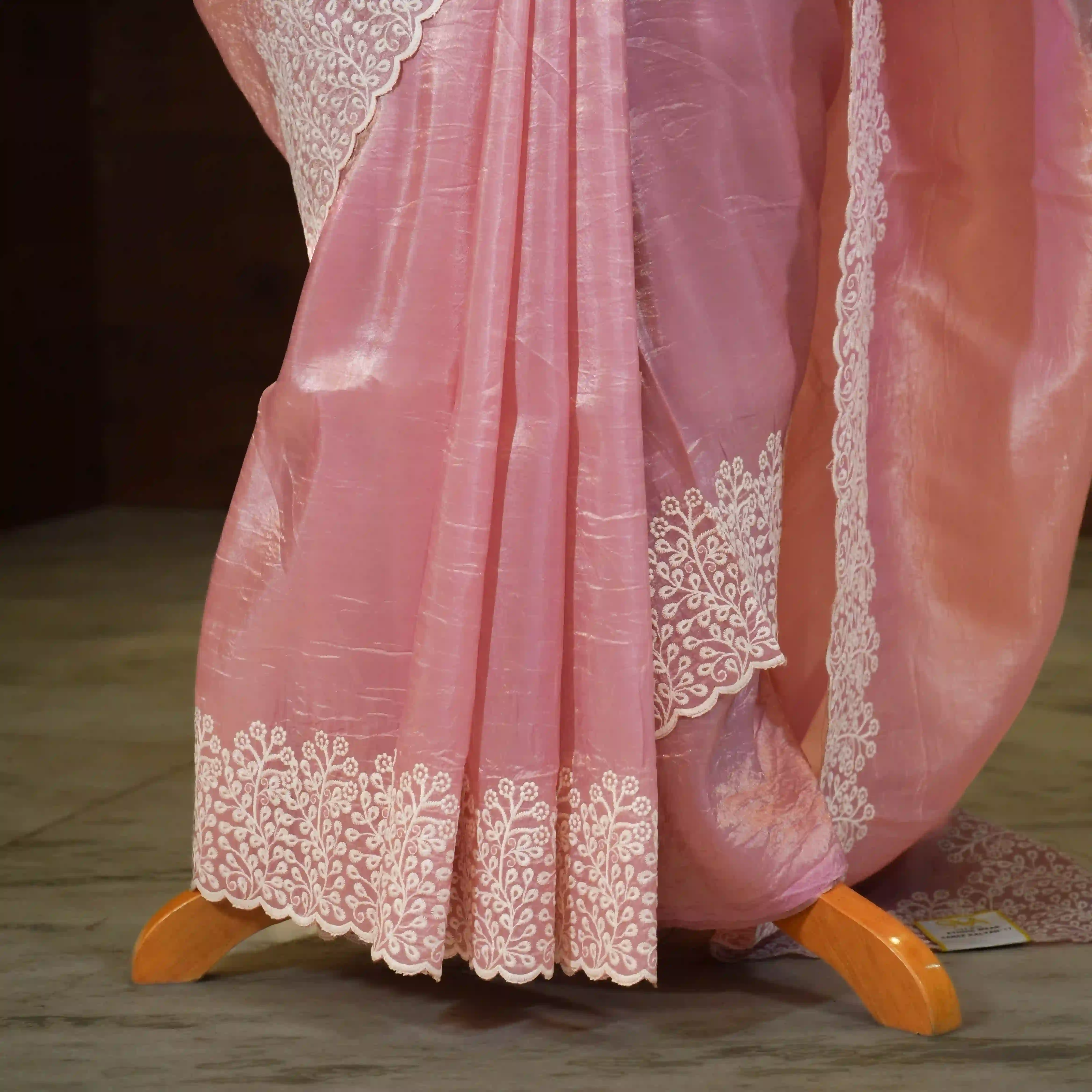 The saree is beautifully detailed with a delicate white embroidery border and neatly finished scallop edges, giving it a refined and feminine touch. It comes with a 0.80 meter blouse piece adorned with beautiful flower embroidery details, allowing you to create a perfectly coordinated ensemble.