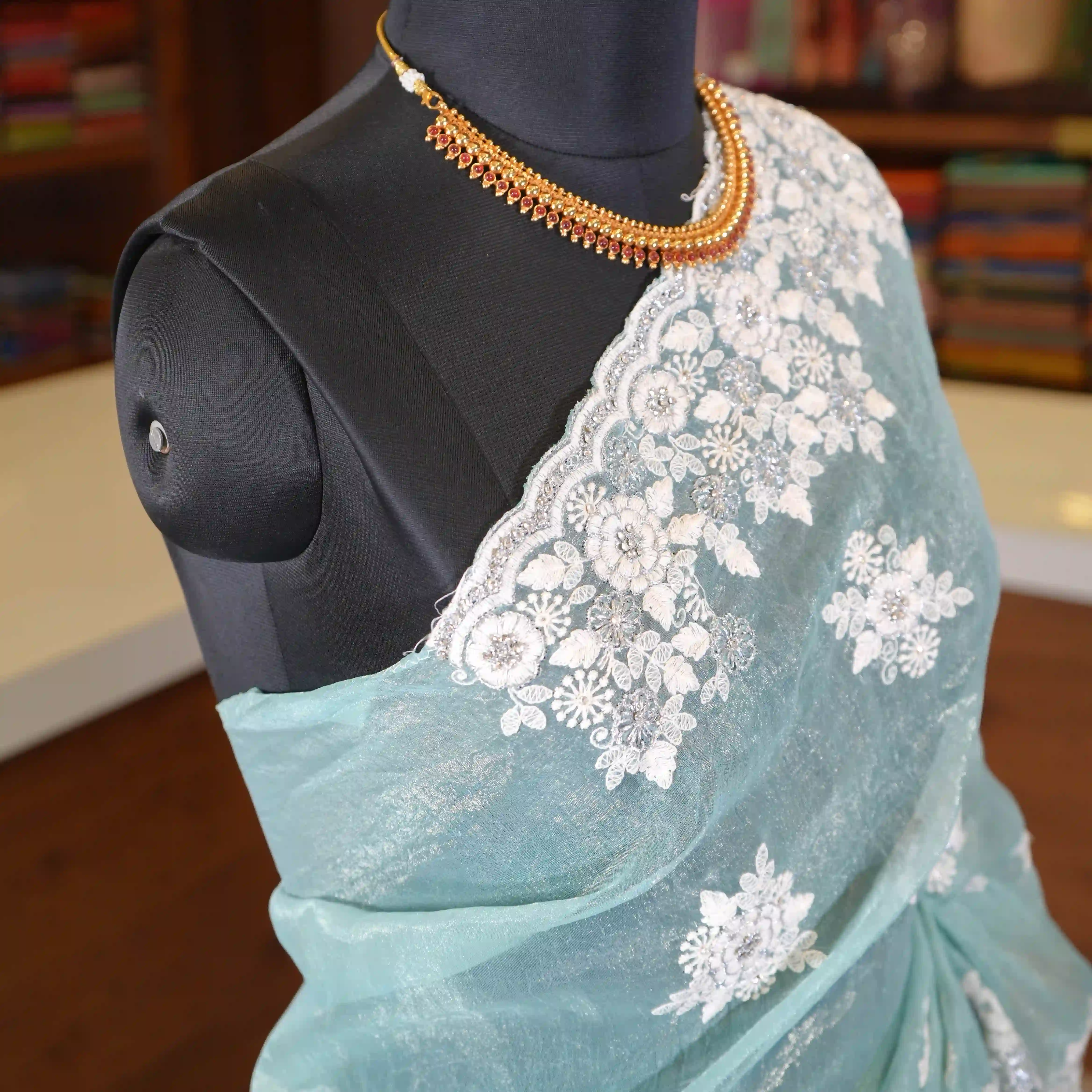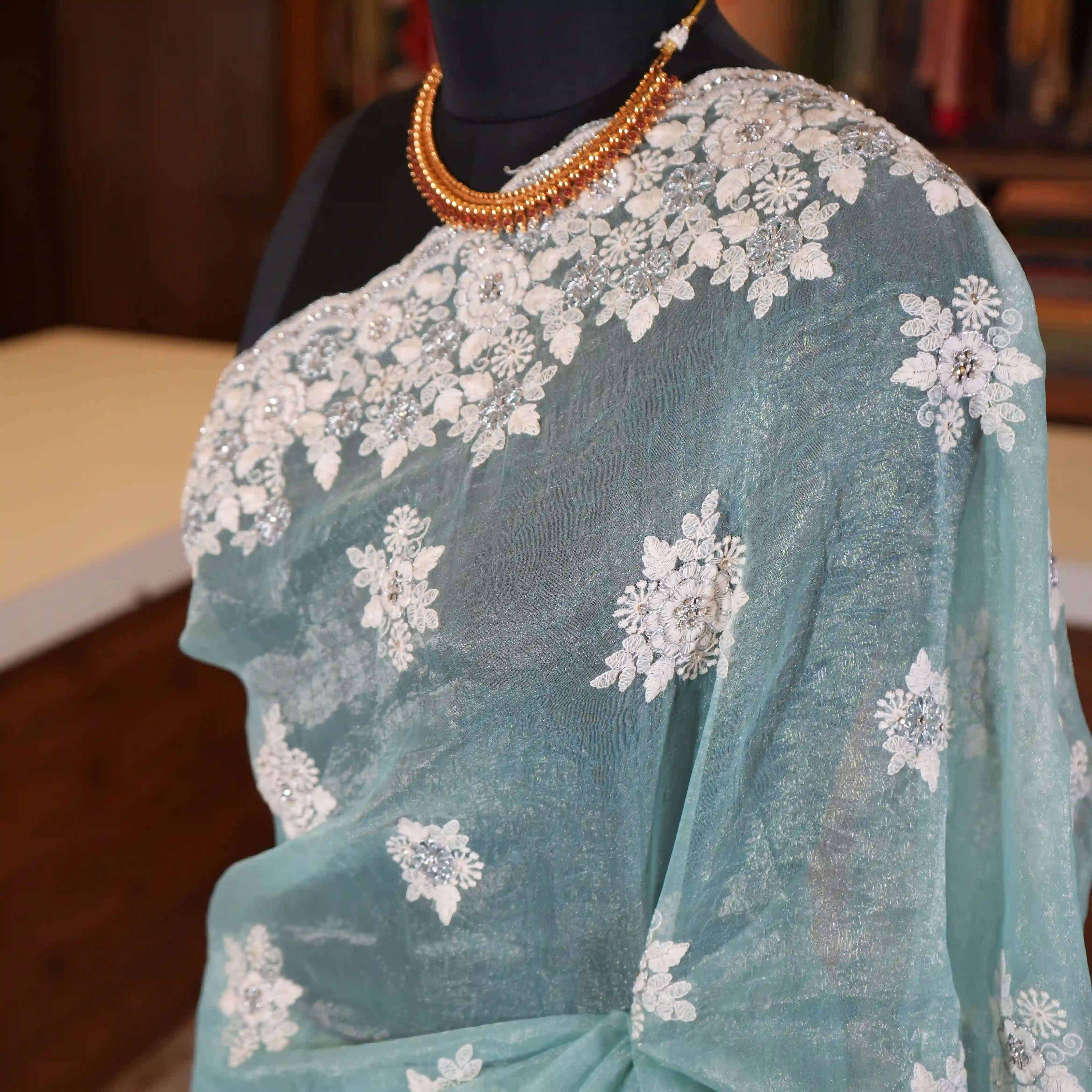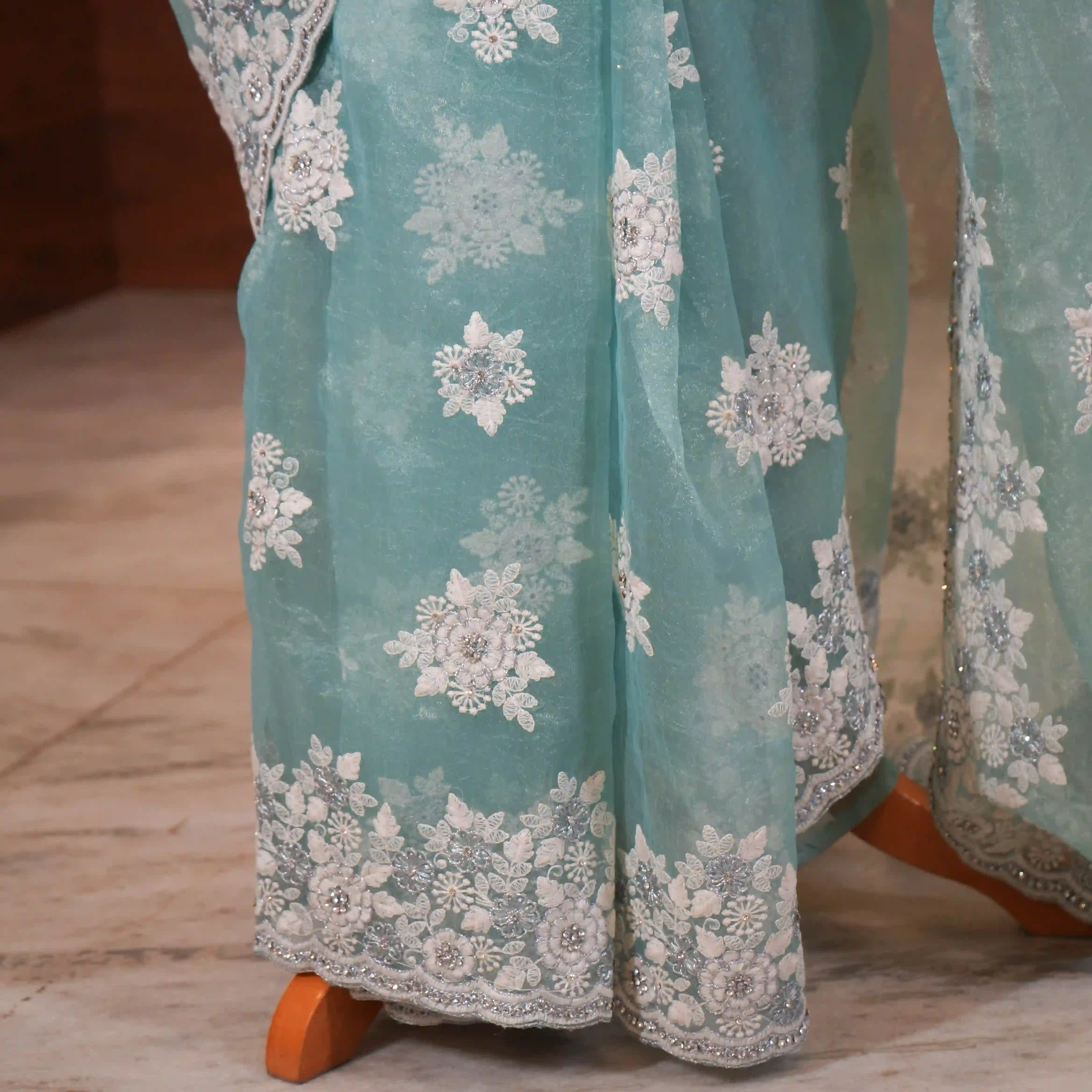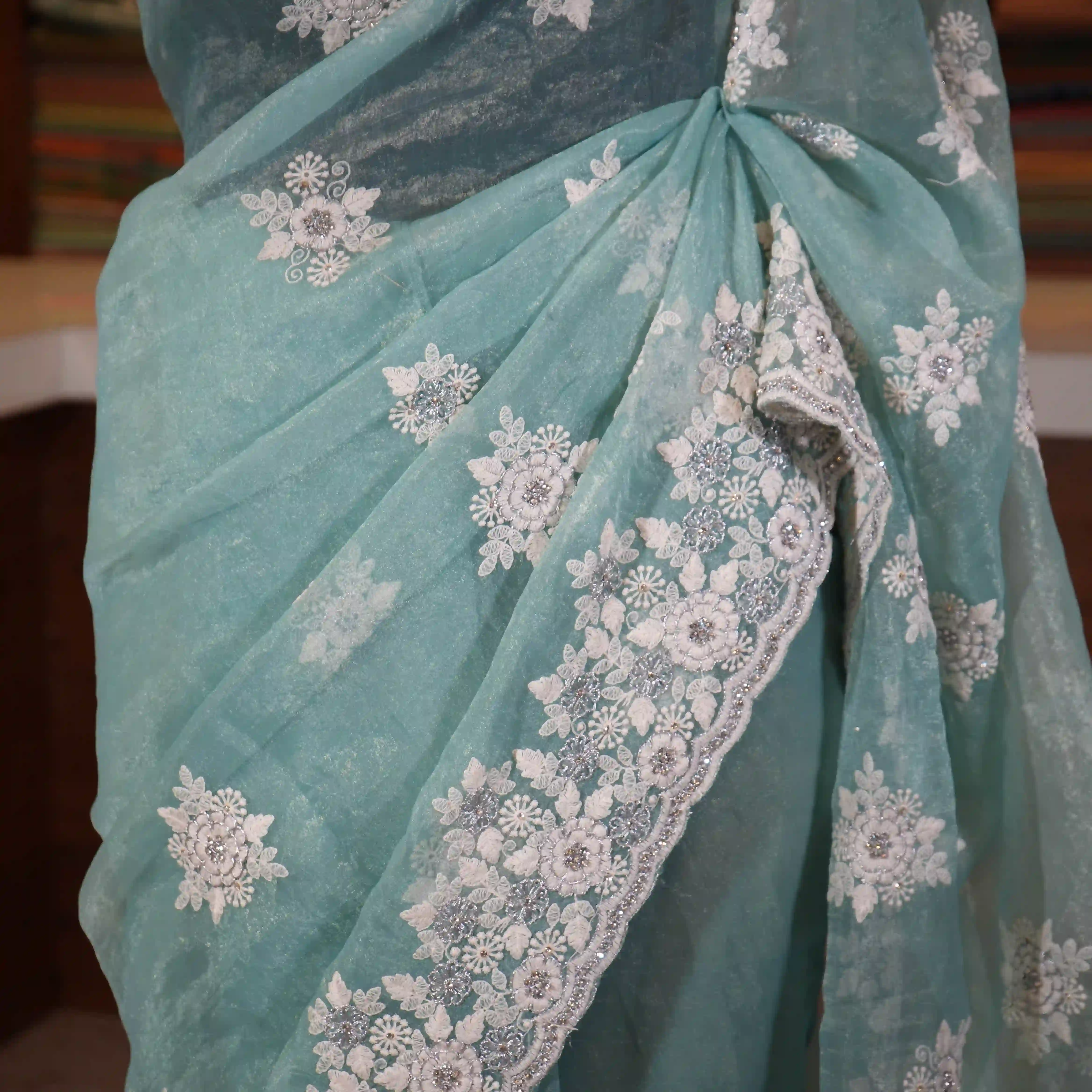 This is a beautiful organza saree adorned with delicate applique work designs that add artistic detail and richness to the overall look. The saree is further enhanced with elegant white embroidery detailing along its border, giving it a refined and classy finish.