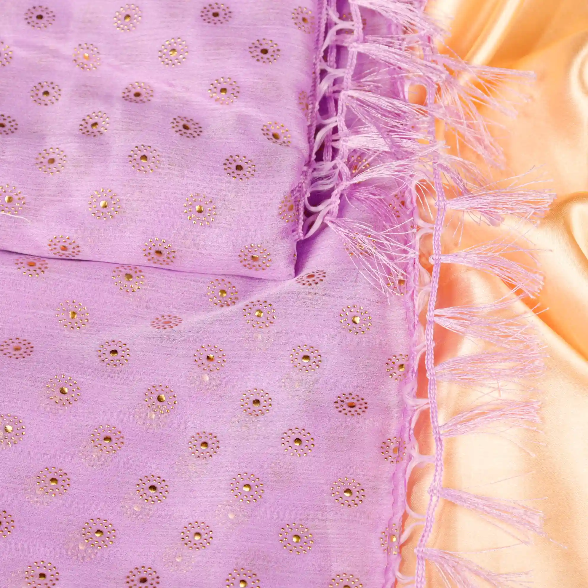 Refresh your ethnic wardrobe with this elegant Foil Butta Work Saree with Tassel Knot at the End, designed to bring effortless charm and festive elegance. Available in soothing Sky Blue and graceful Lavender colour options, this saree features delicate foil butta prints that add a subtle shimmer and refined appeal.