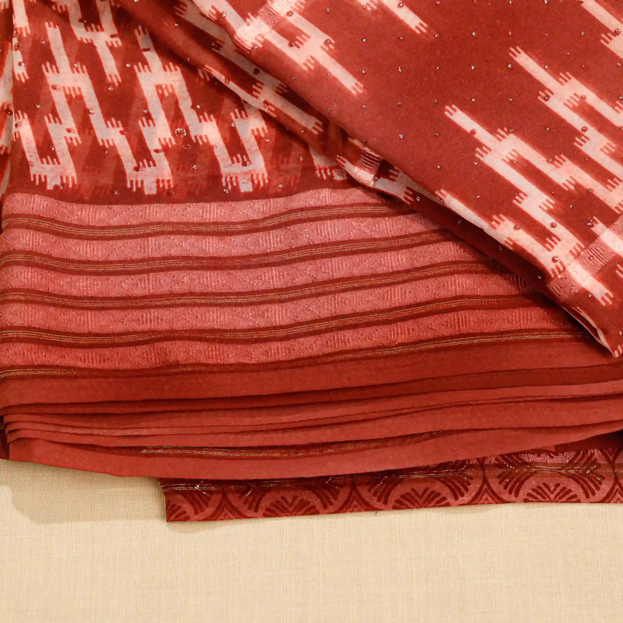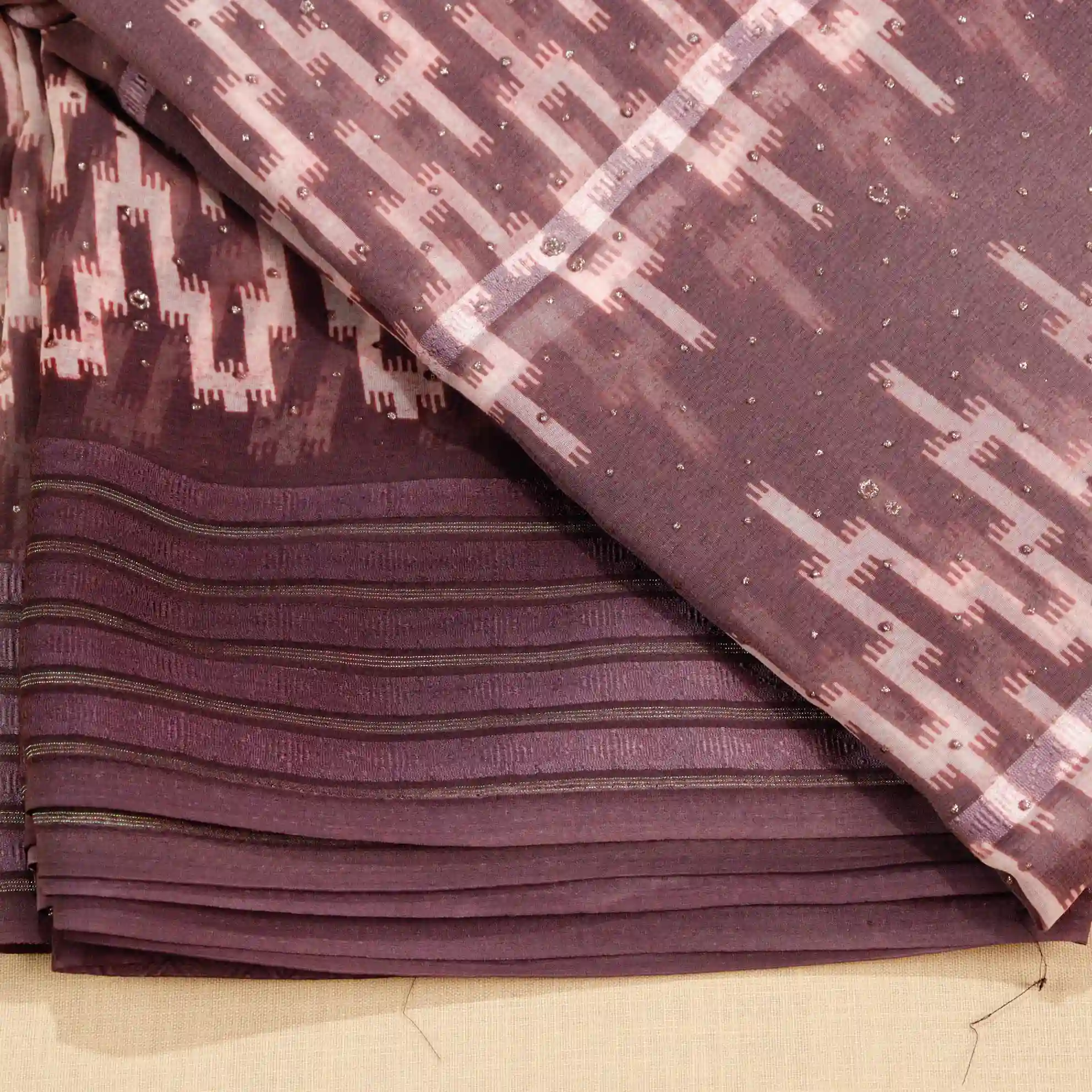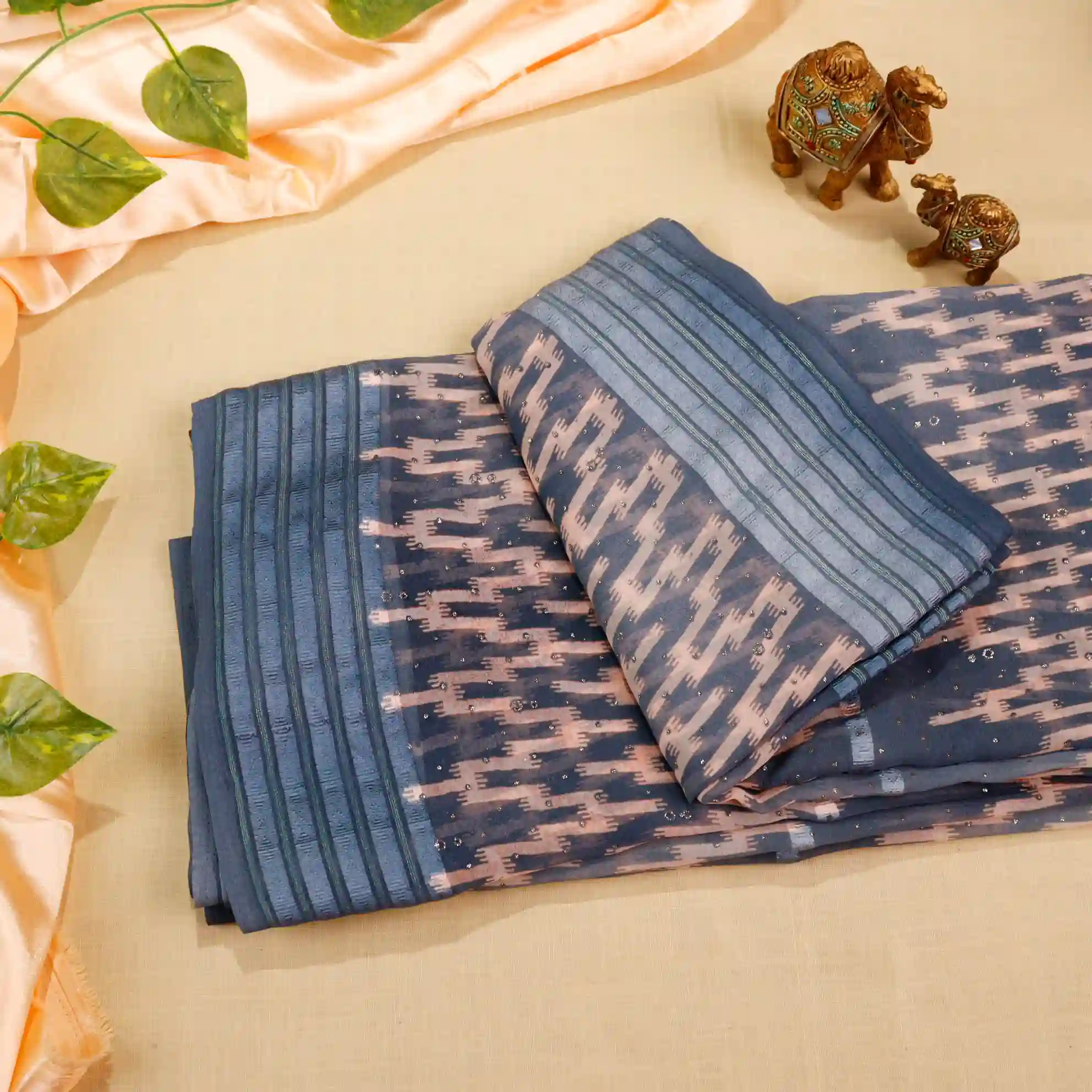 The saree is enhanced with a foil print design, adding a subtle shimmer that elevates its overall look. It comes paired with a matching printed blouse, provided in a 0.80 metre length, allowing for easy customization. The combination of soft fabric and refined detailing makes this saree a versatile choice for both festive moments and special occasions.