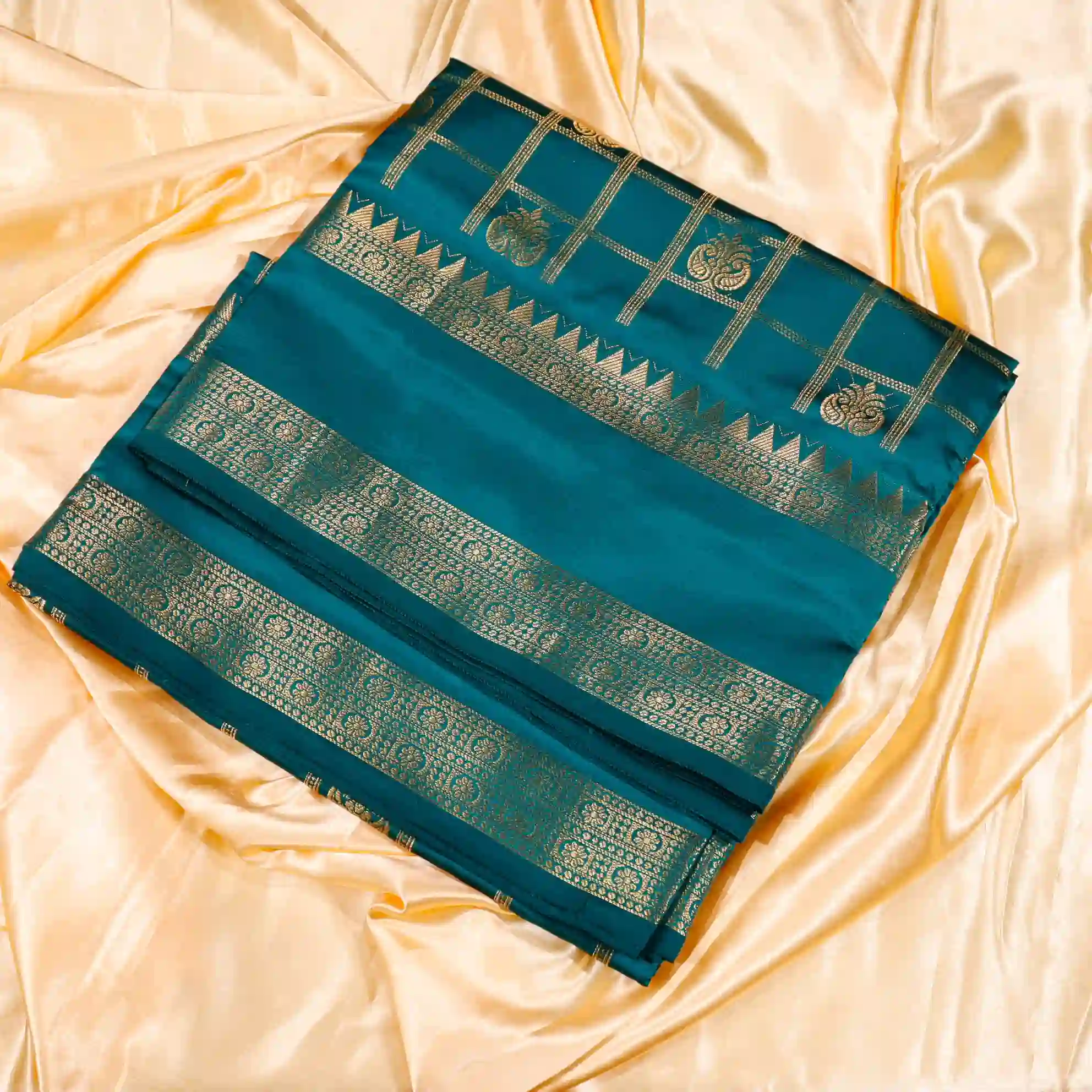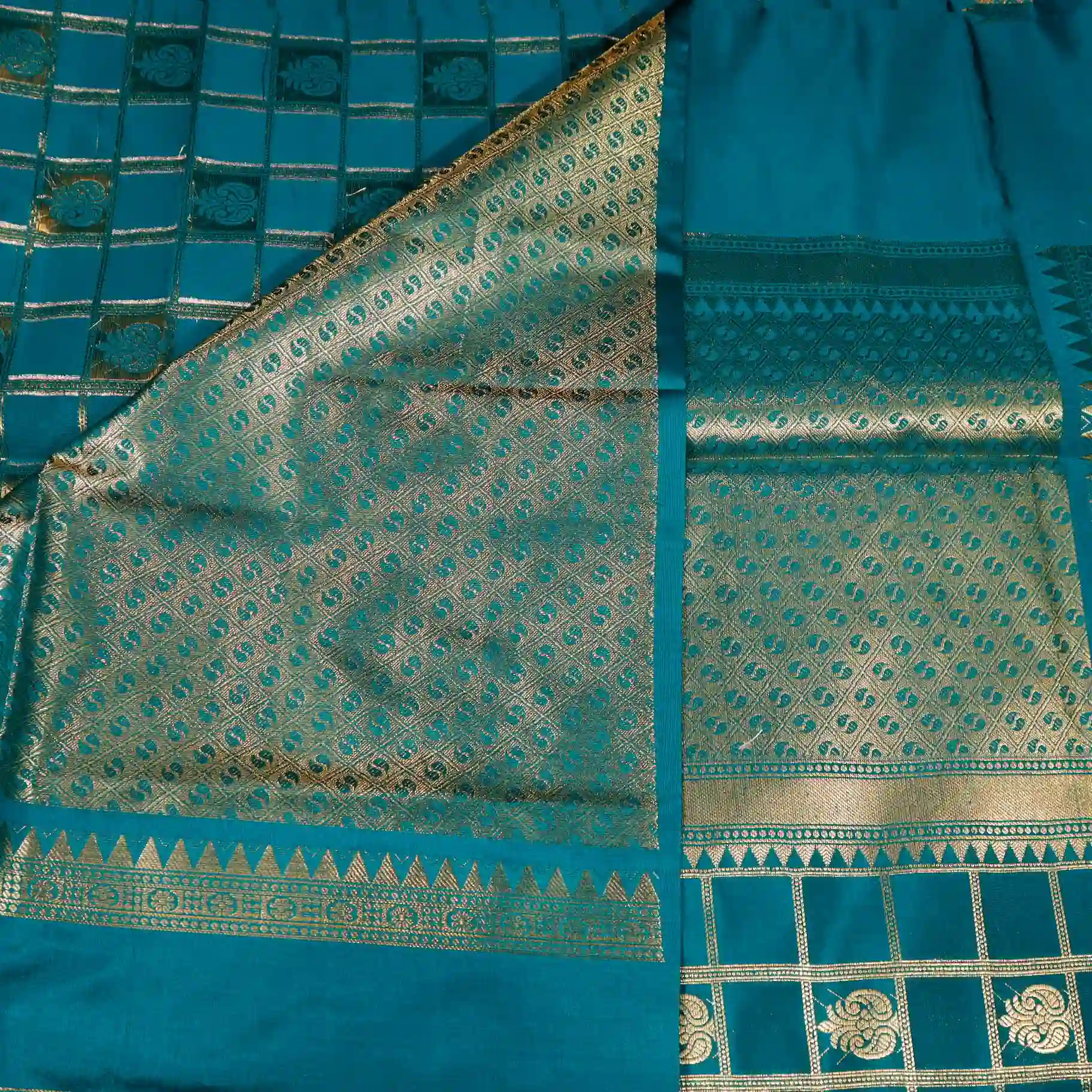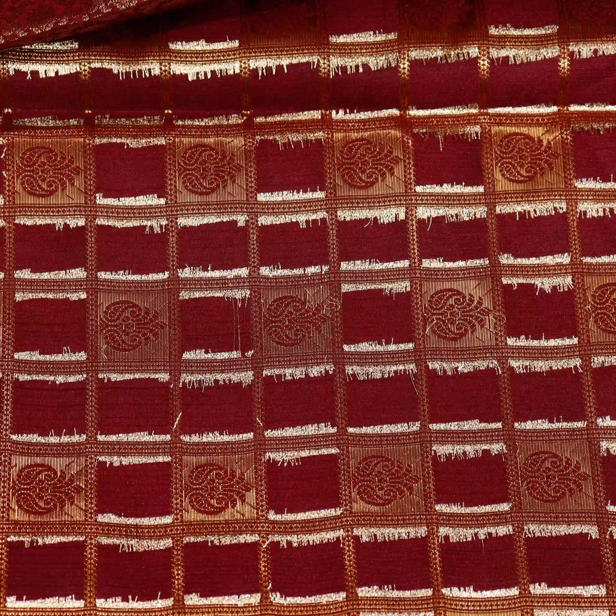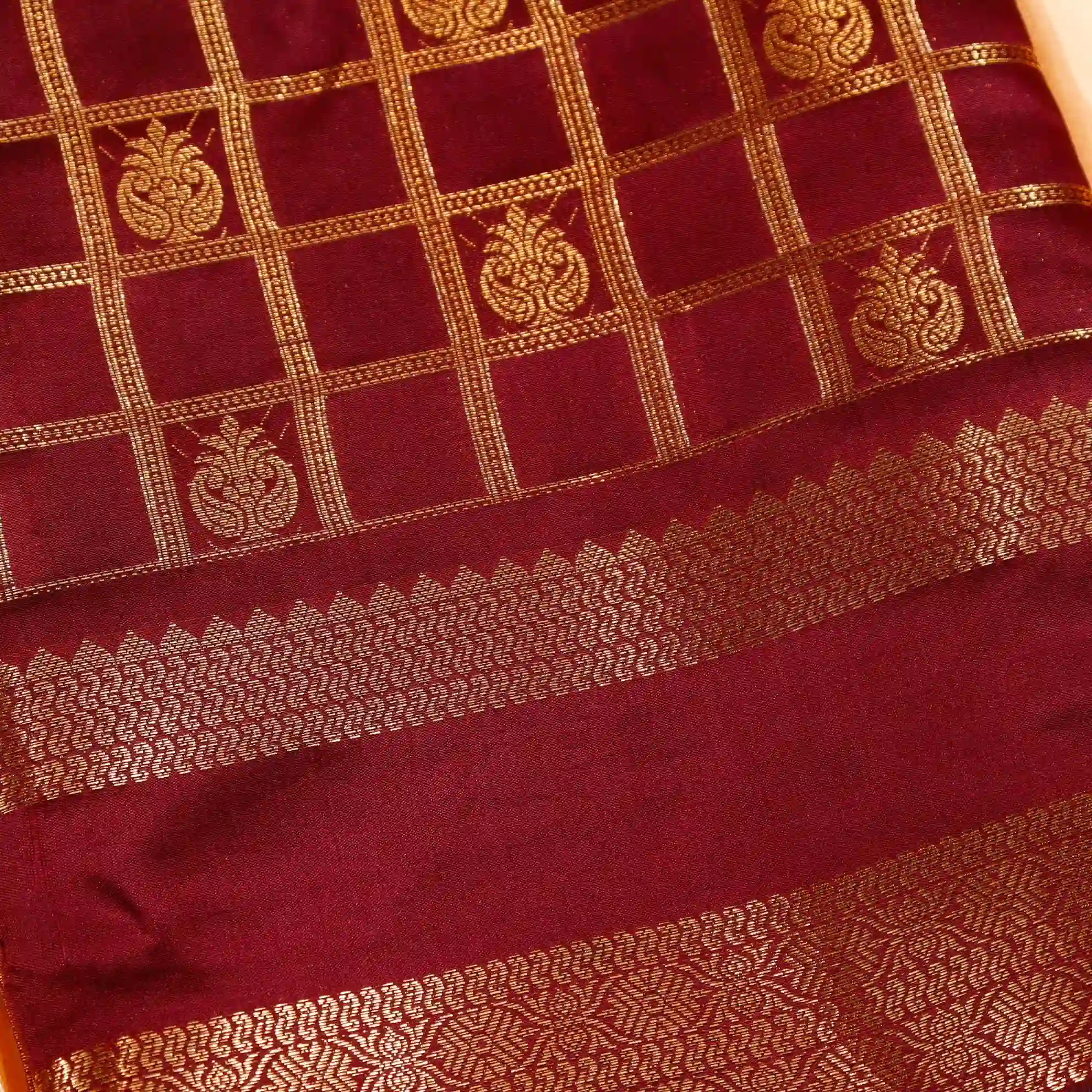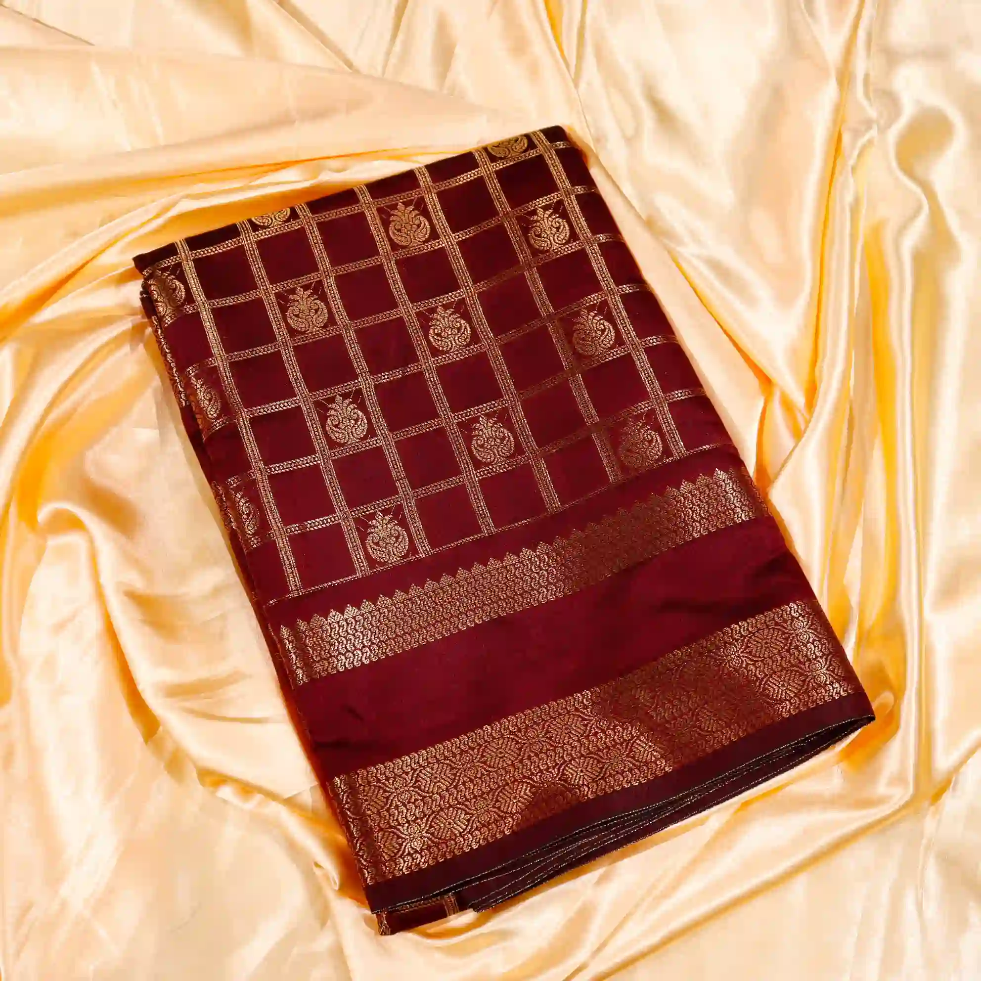 This saree features a classic checked pattern, giving it a sophisticated and graceful appeal. The fine weaving and subtle sheen add a royal touch, making it suitable for both festive occasions and traditional gatherings.