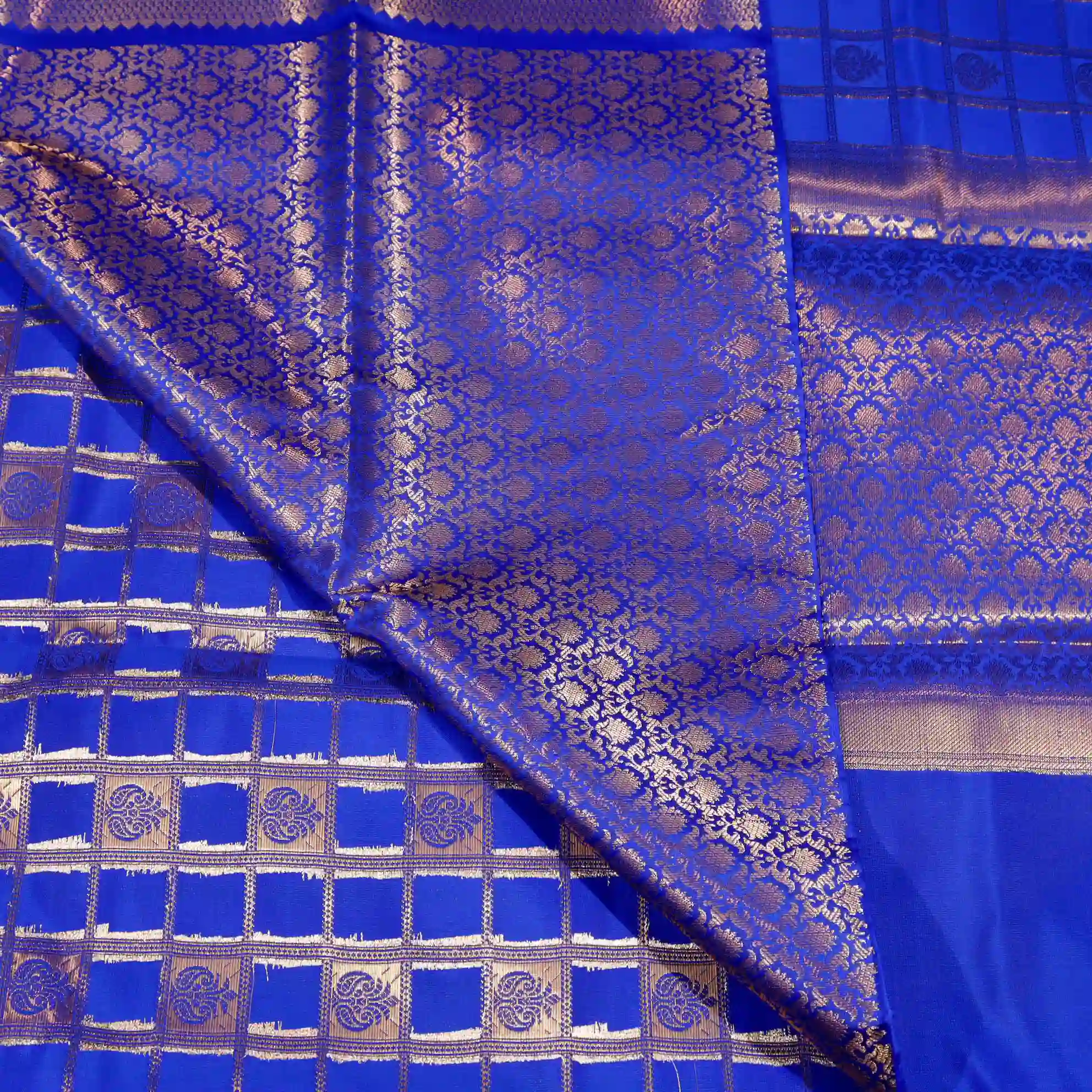 Step into elegance with this stunning Katan Checked Saree, crafted from premium-quality katan silk that reflects rich tradition and timeless beauty. Known for its smooth texture and durability, katan silk offers a luxurious drape that enhances your overall look.
