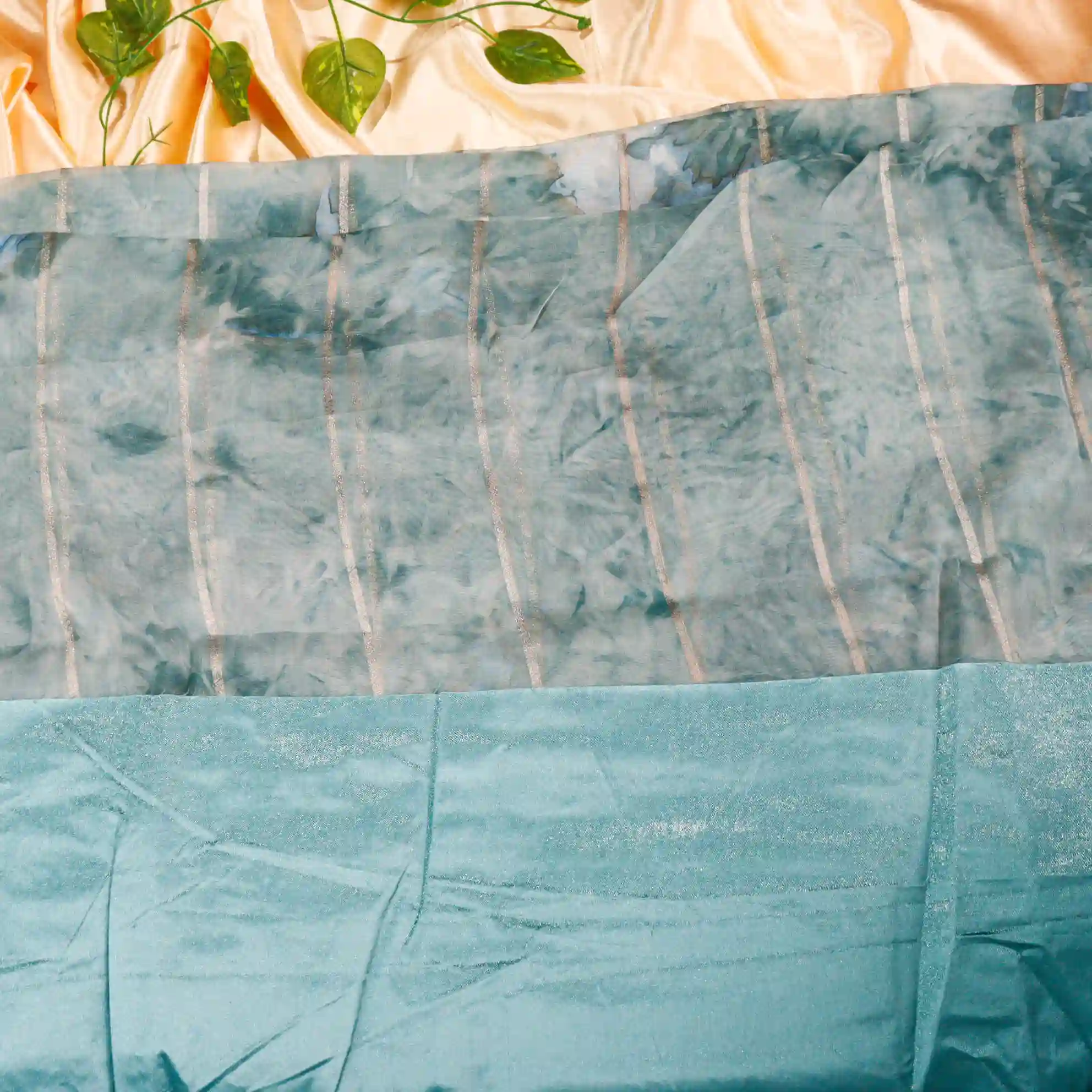 It comes paired with a plain soft tissue satin blouse measuring 0.80 meters, enhanced with gold stone work detailing on the sleeves, completing the look with a rich and polished finish.