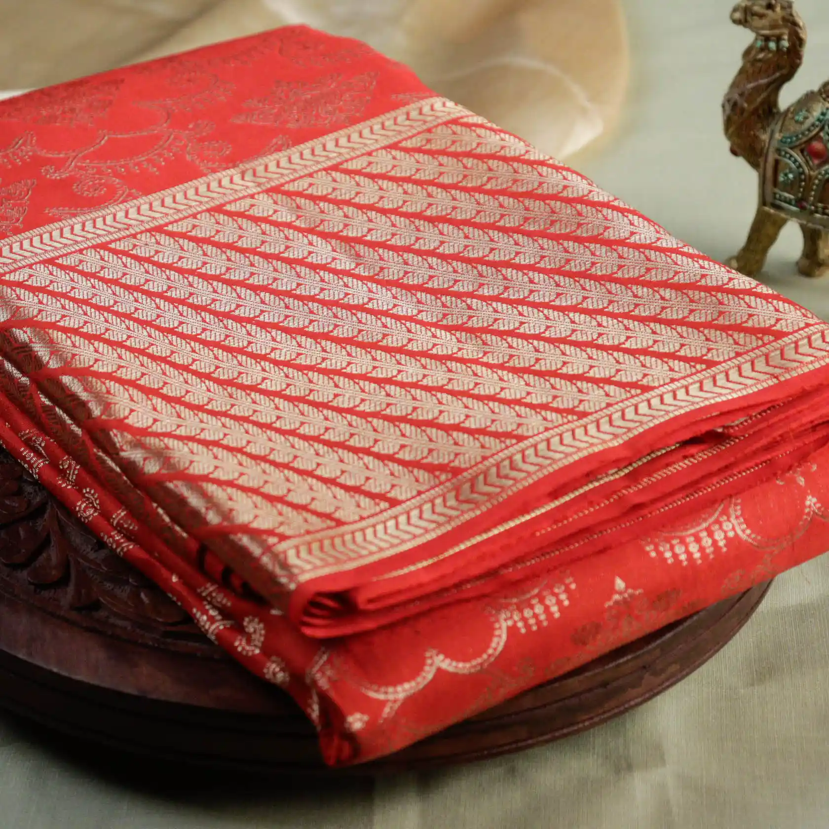 The luxurious silk base is enhanced with intricate zari detailing, offering a subtle sheen that elevates the saree’s overall charm. Complementing the body is a classic woven zari border, designed with traditional medallion elements that add depth and structure without overpowering the look. The contrast between the bold red hue and shimmering zari makes this saree an ideal choice for weddings, bridal ceremonies, and grand festive occasions.