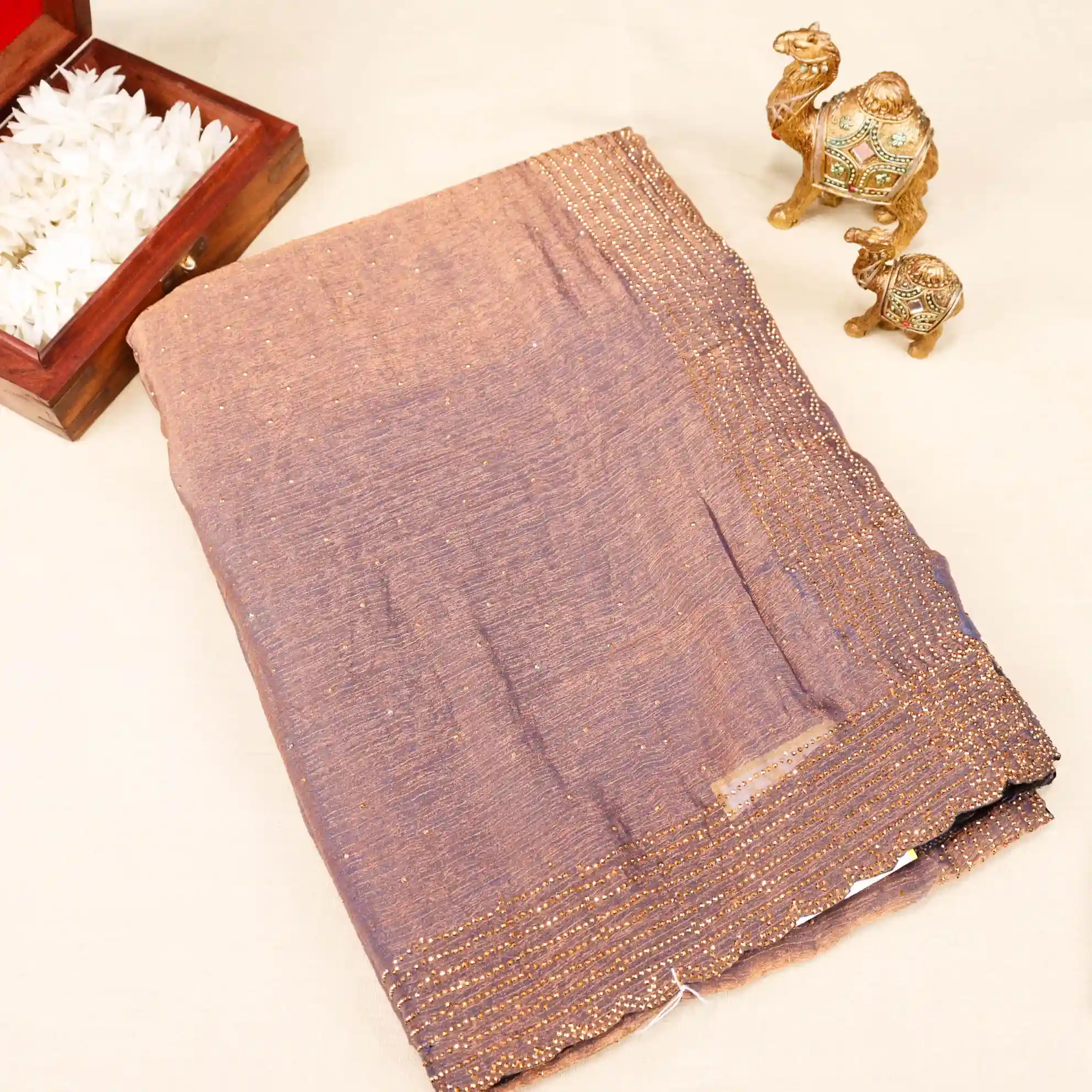The highlight of this saree is the intricate stone work detailing arranged in four elegant layers, adding a subtle shimmer and graceful dimension without being overpowering. The rich onion pink colour enhances its festive appeal, making it an ideal choice for weddings, receptions, festive celebrations, parties, and special occasions.