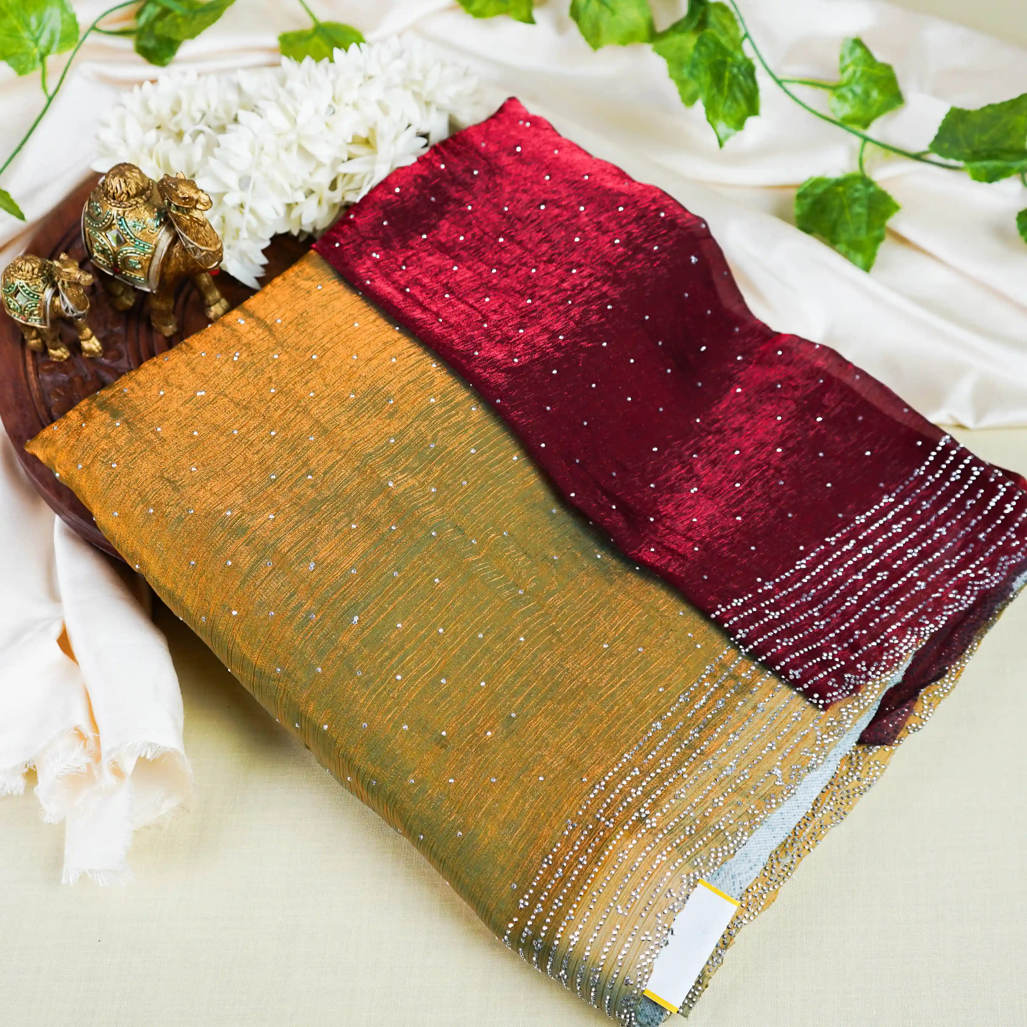 crafted to highlight rich colors and graceful detailing. The saree showcases a warm golden-olive body enhanced with delicate stone highlights, paired with a striking deep maroon pallu that adds a bold and festive contrast.