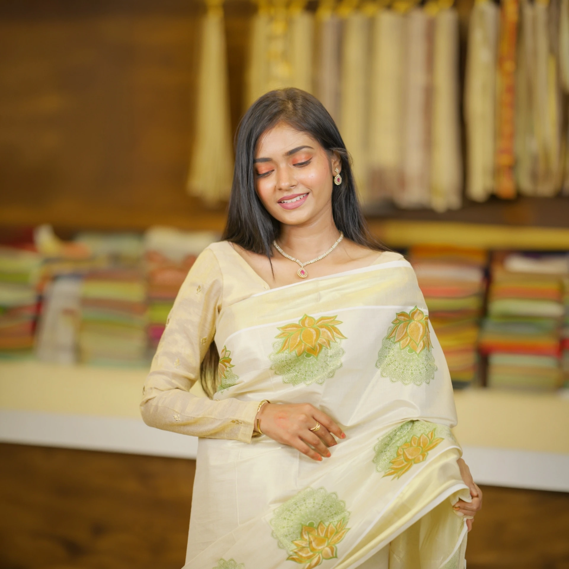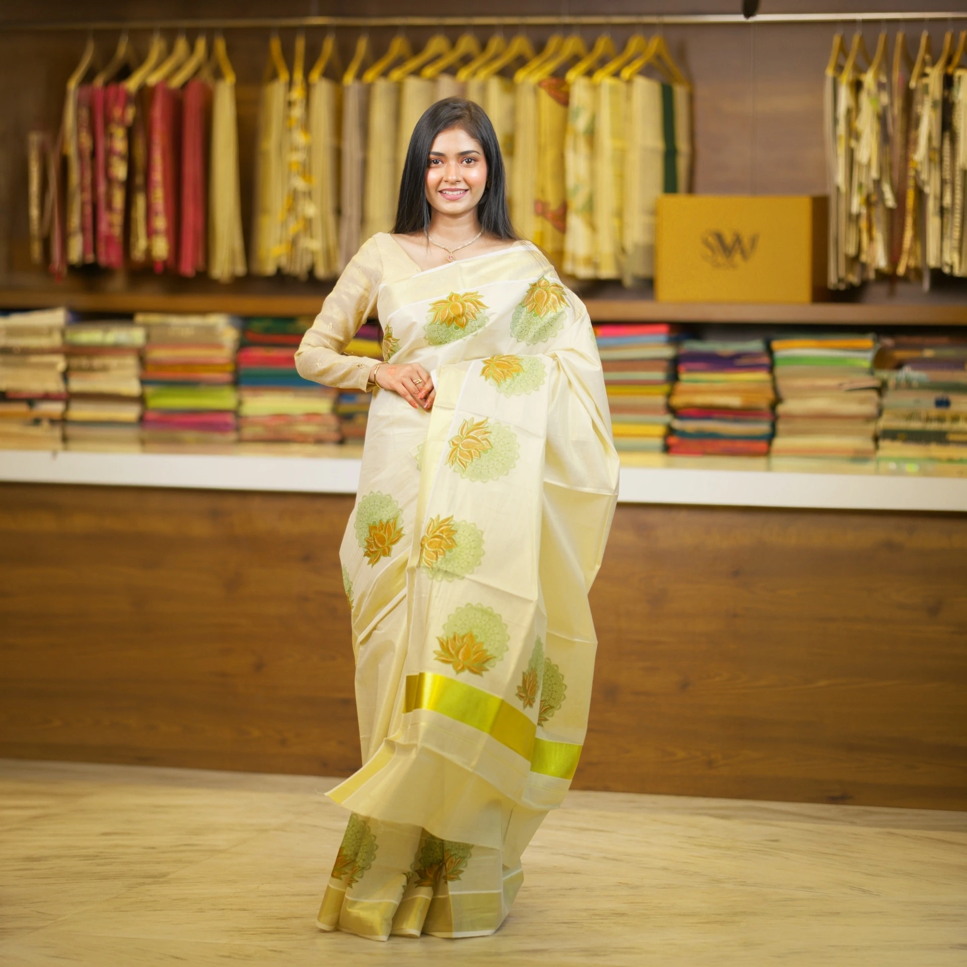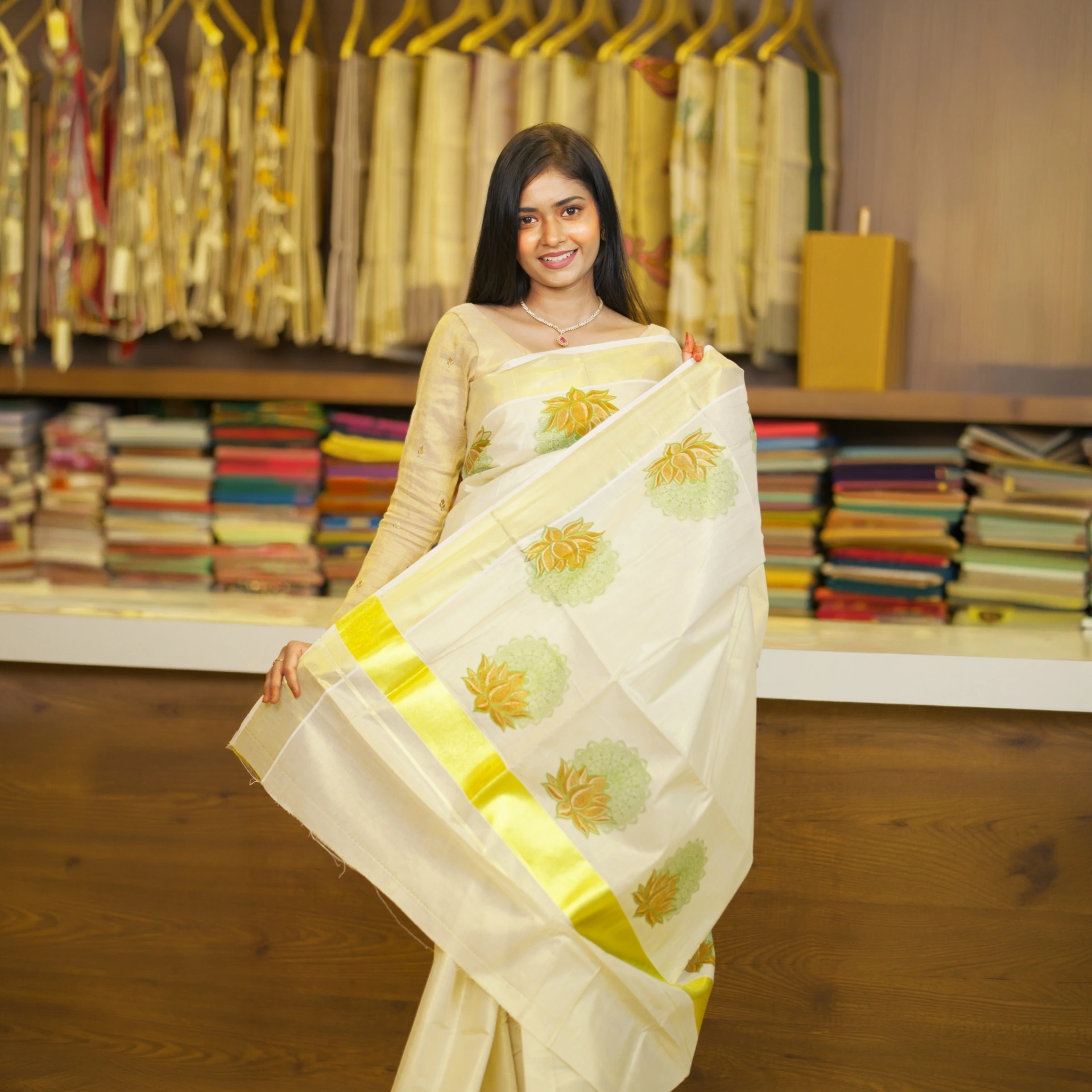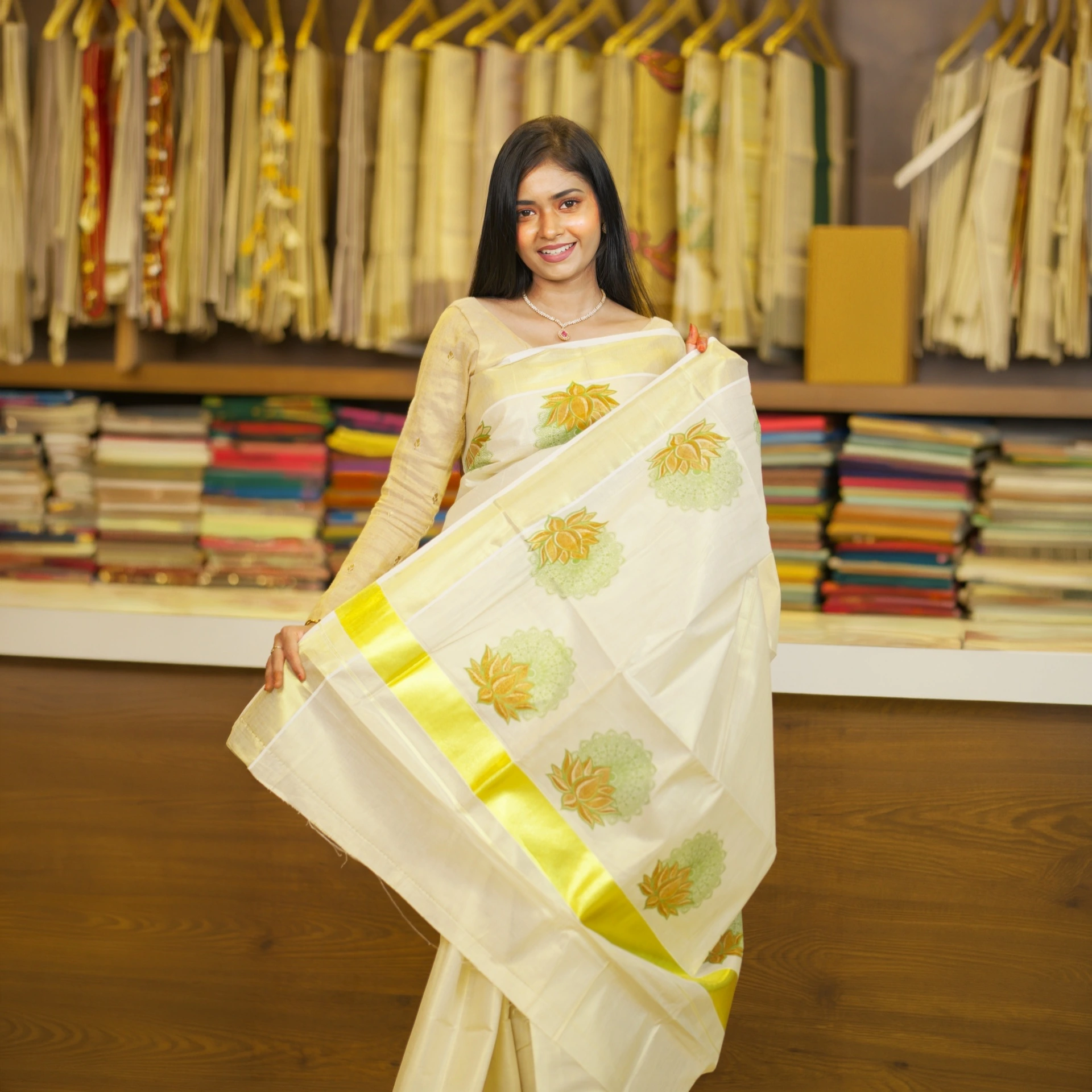 Adorned with delicate lotus butta motifs all over, the saree adds a touch of traditional charm while maintaining a modern appeal. The lightweight texture ensures a comfortable drape, making it perfect for long hours during festive occasions and celebrations.